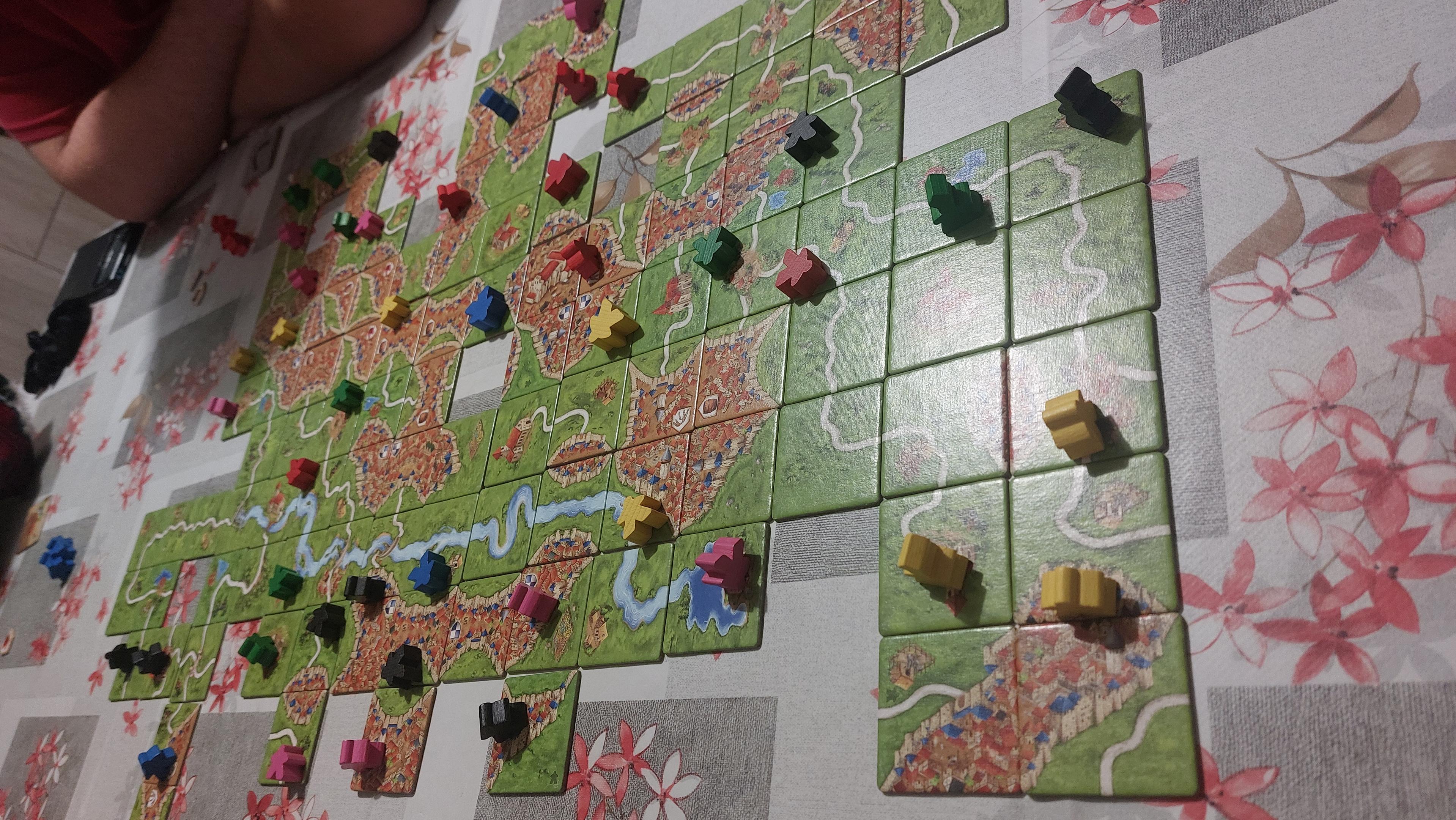 Partita sanguinosa del gioco da tavolo Carcassonne con 6 giocator3 agguerrit3.