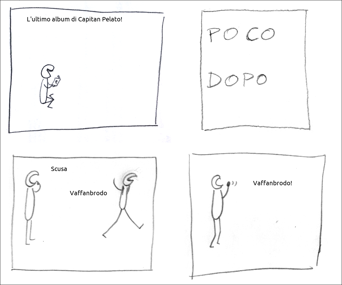un tizio legge un fumetto e dice: «L'ultimo album di Capitan Pelato!» didascalia: poco dopo il primo tizio perplesso dice: «Scusa», il secondo scocciato se ne va dicendo: «Vaffanbrodo» il tizio rimasto urla: «Vaffanbrodo!»