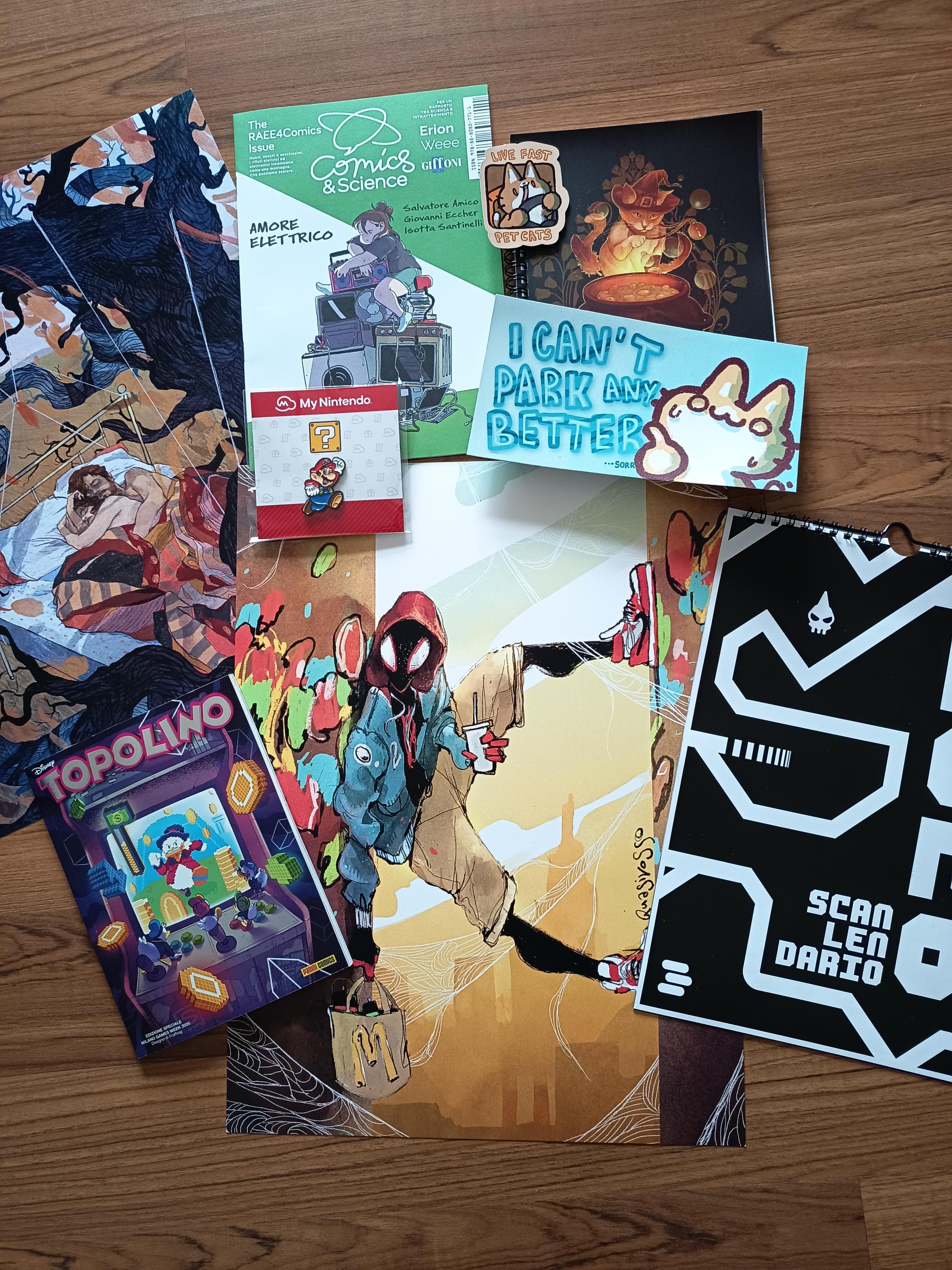 Foto di cose su un pavimento. Le cose: - Scanlendario 2026 - Due illustrazioni di Gio Quasirosso (uno Spider-Man Morales e un'illustrazione di due persone in un letto che si abbracciano, il letto รจ fuori all'aperto, in primo piano c'รจ un albero) - Topolino con copertina di Zio Paperone che insegue soldi in un arcade - Adesivi con scritto "I can't park any better sorr..." e "Live Fast Pet Cats", un quadernetto con un'art di una gatta streghetta - Una spilla di Super Mario - Libricino sui RAEE illustrato