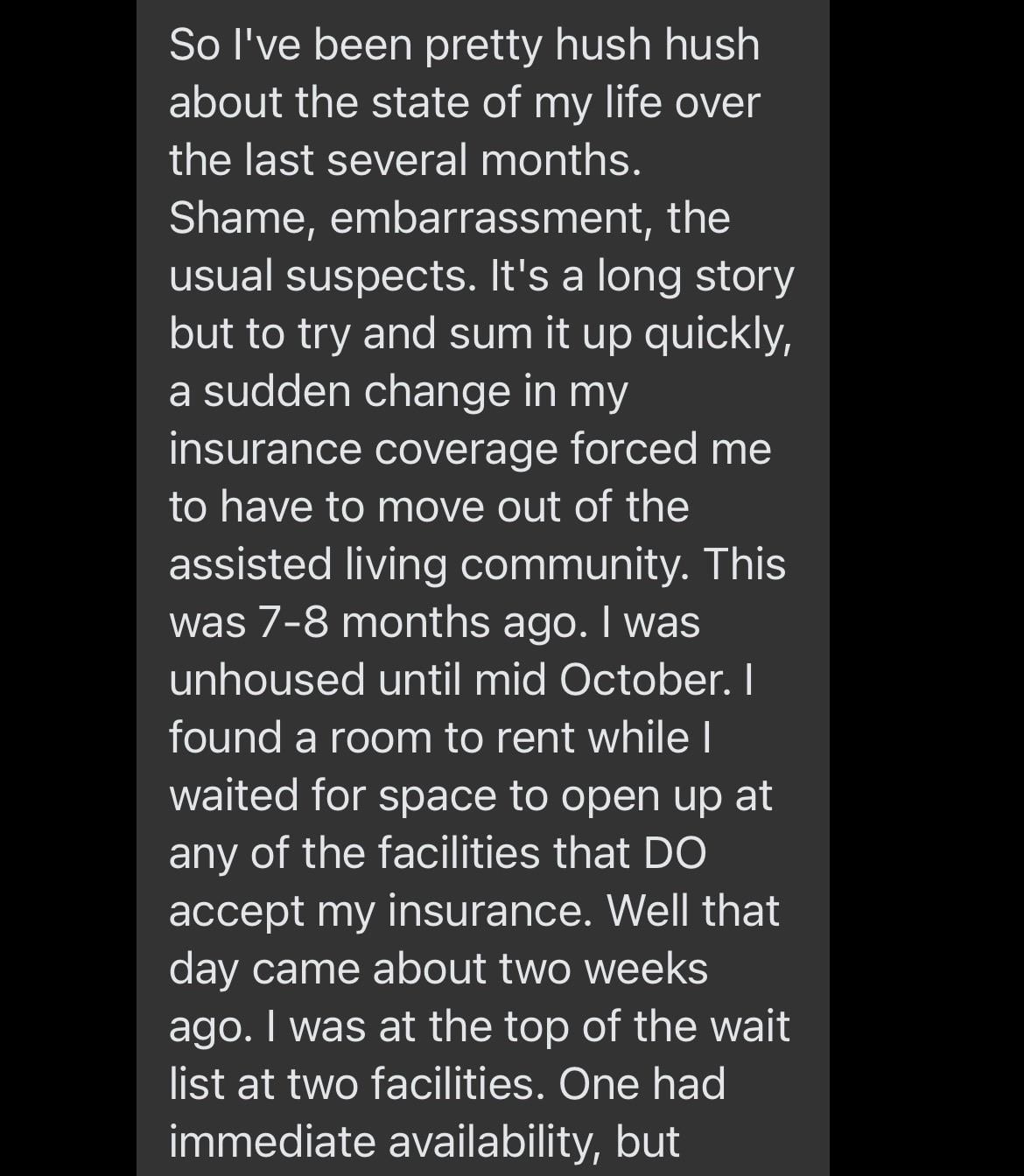 So I've been pretty hush hush about the state of my life over the last several months. Shame, embarrassment, the usual suspects. It's a long story but to try and sum it up quickly, a sudden change in my insurance coverage forced me to have to move out of the assisted living community. This was 7-8 months ago. I was unhoused until mid October. I found a room to rent while I waited for space to open up at any of the facilities that DO accept my insurance. Well that day came about two weeks ago. I was at the top of the wait list at two facilities. One had immediate availability, but