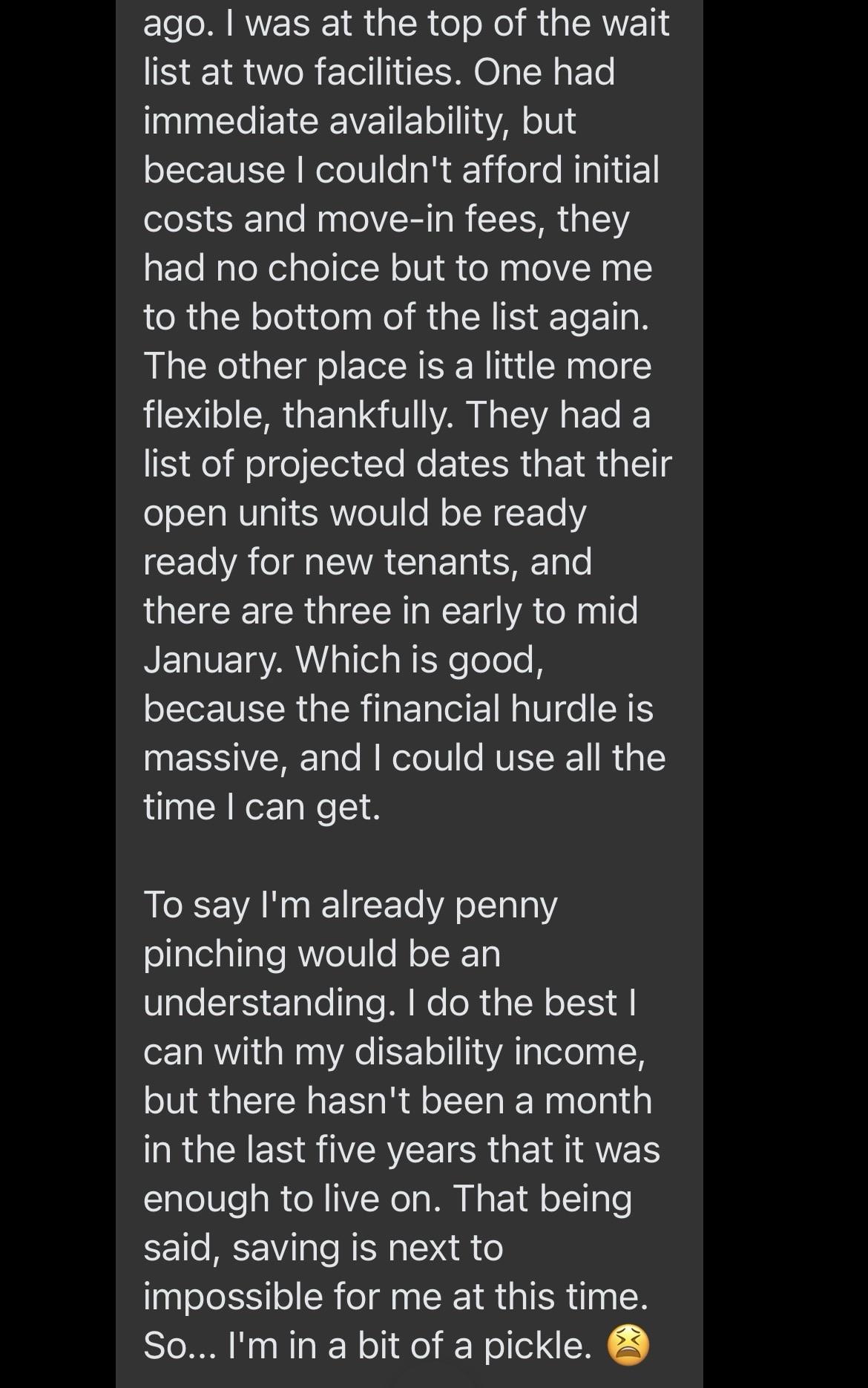 because I couldn't afford initial costs and move-in fees, they had no choice but to move me to the bottom of the list again. The other place is a little more flexible, thankfully. They had a list of projected dates that their open units would be ready ready for new tenants, and there are three in early to mid January. Which is good, because the financial hurdle is massive, and I could use all the time I can get. To say I'm already penny pinching would be an understanding. I do the best I can with my disability income, but there hasn't been a month in the last five years that it was enough to live on. That being said, saving is next to impossible for me at this time. So... I'm in a bit of a pickle. 😫