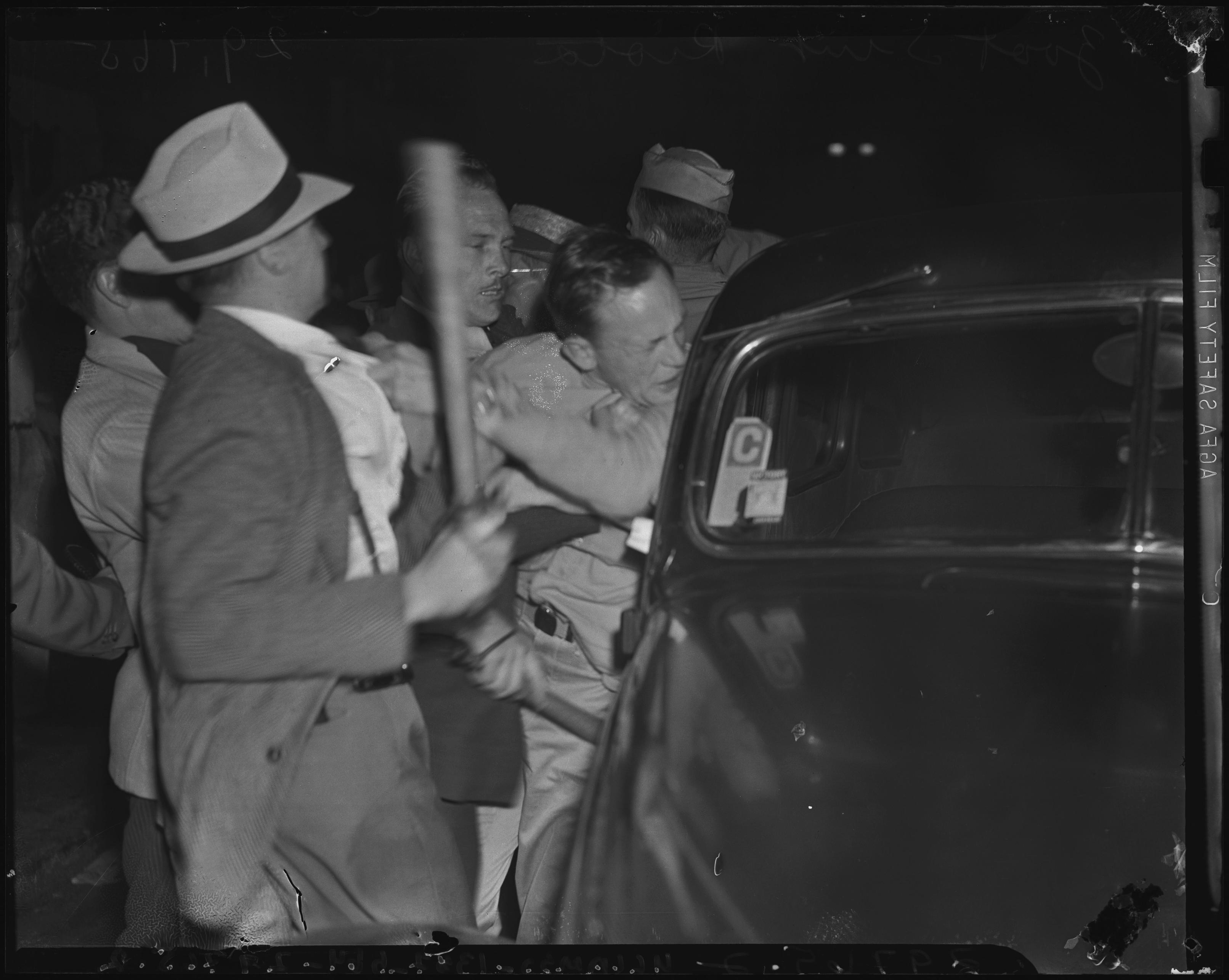 As a man is seemingly trying to break the passenger window on a car, another man confronts him with a bat or club as others in the skirmish crowd nearby, including men in armed services uniforms.