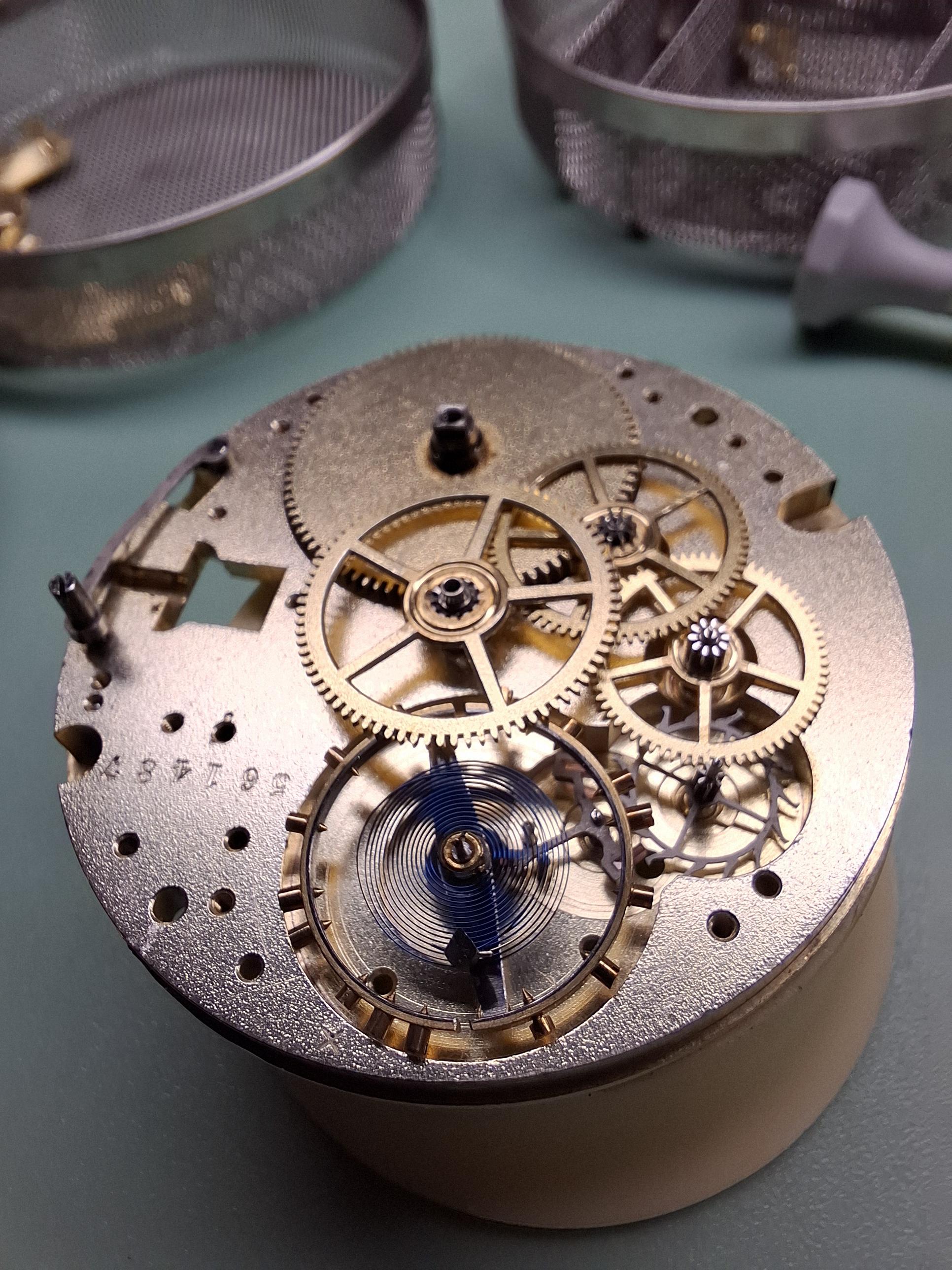 Photo d'un train de rouage et Γ©chappement sans les ponts par dessus.