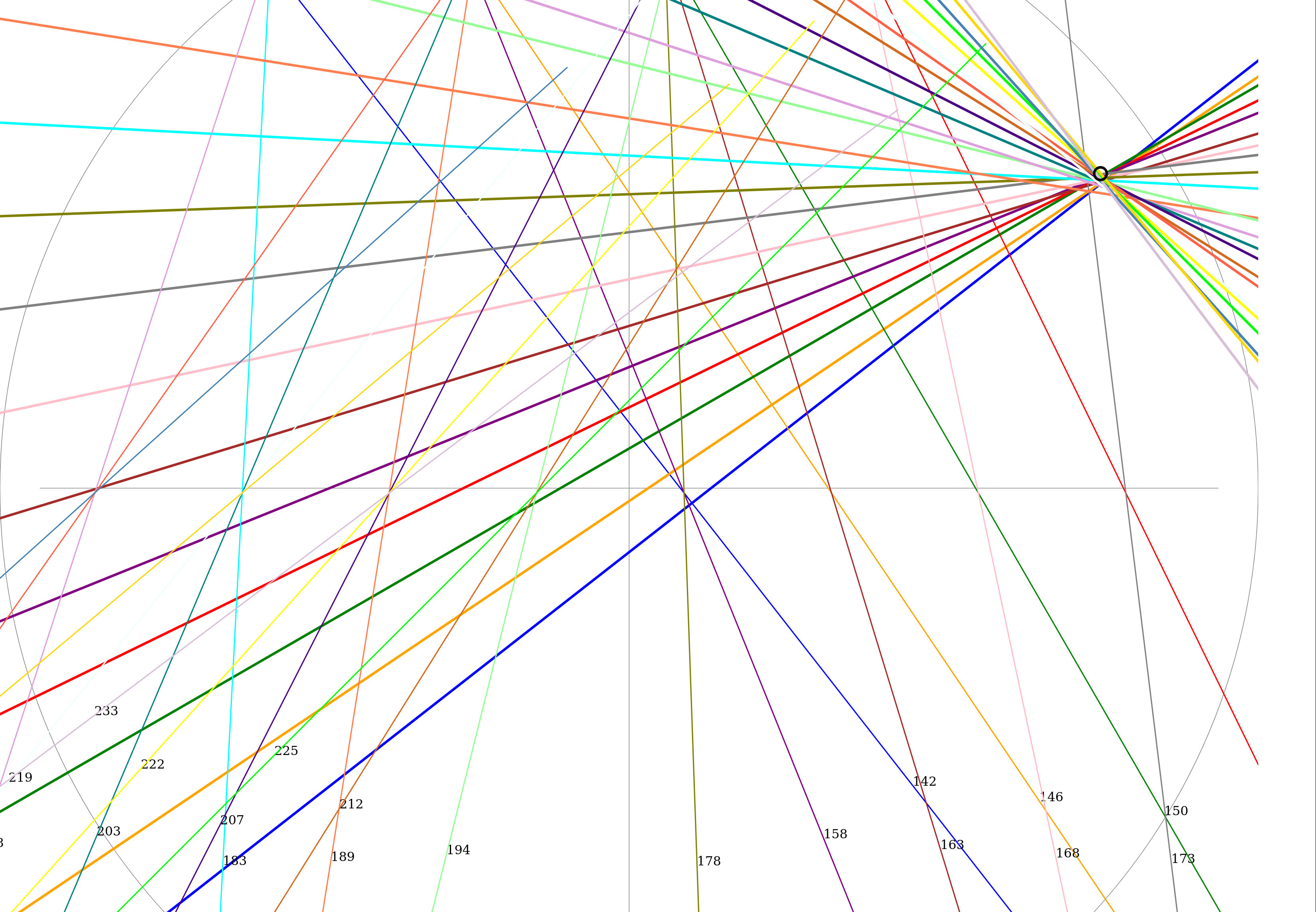 lots of colored lines that cross at a point with a small circle drawn nearby