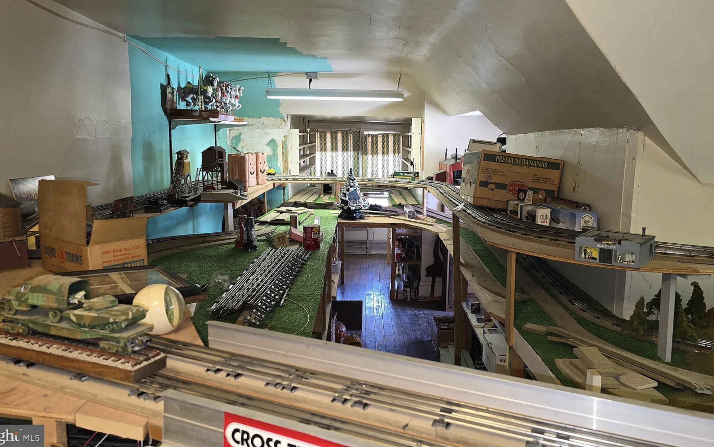 The attic of a house which has been taken over by a model railway snaking its way around the room