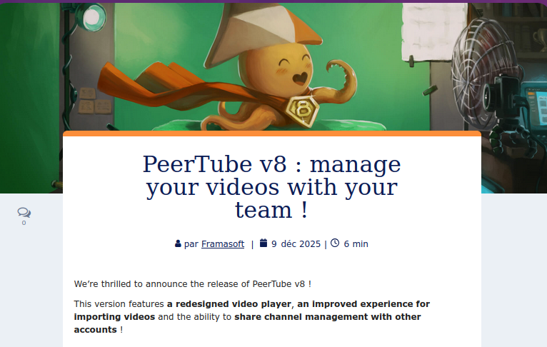 PeerTube v8 : manage your videos with your team ! par Framasoft | 9 DΓ©c 2025 | β―Temps de lecture 6 min Weβre thrilled to announce the release of PeerTube v8 ! This version features a redesigned video player, an improved experience for importing videos and the ability to share channel management with other accounts !