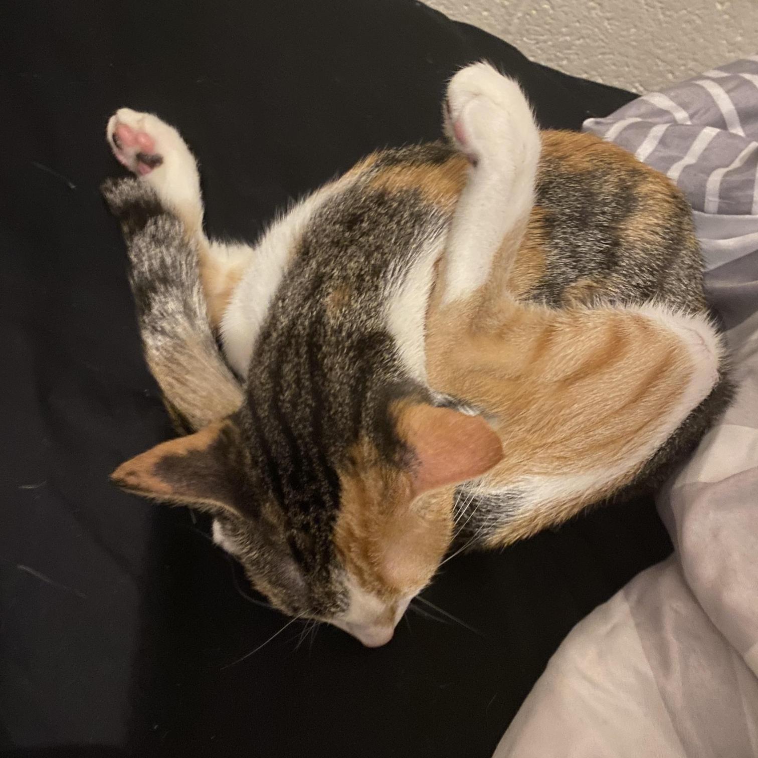 Photo of a cat sleeping on a bed, but its head is tucked in between its legs by its tail. So it's basically just folded in half like some kind of kitty origami or maybe a it's the return of the Popplesβ’. You'd think it might be uncomfortable, but that's just human thinking. Cats are always comfy (even when they look crumbled up like that laundry you never put on hangers on that one chair).