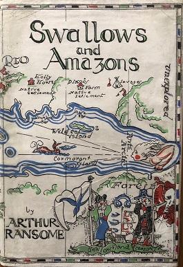 First edition dust jacket cover of Swallows and Amazons novel by English author Arthur Ransome, 1930. The 1930 first edition dust jacket of "Swallows and Amazons" by Arthur Ransome, featuring a charming hand-drawn map showing lakes, islands, and sailing routes. The whimsical illustration includes decorative cartouches with children in boats, nautical elements, and place names rendered in a playful, storybook style that captures the adventure of children's sailing expeditions. https://en.wikipedia.org/wiki/Swallows_and_Amazons#/media/File:ArthurRansome_SwallowAndAmazons.jpg