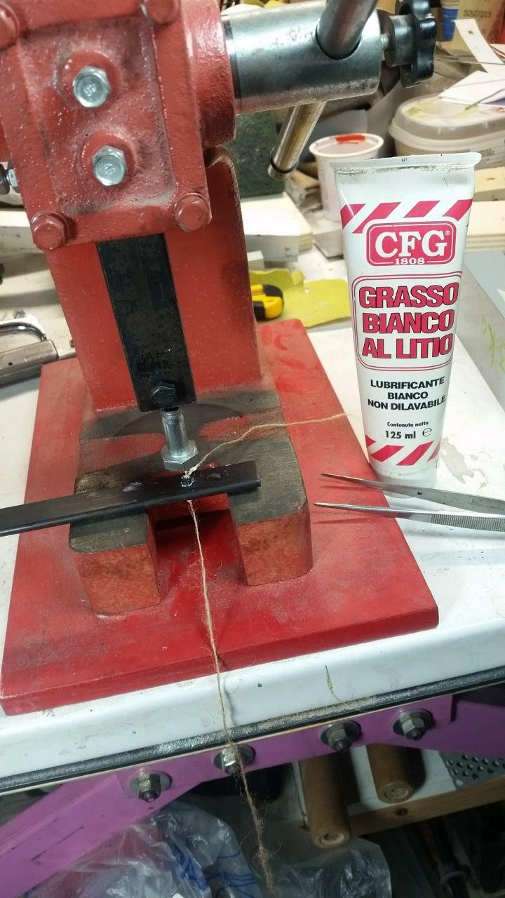 Morsa a cremagliera con la barra di un morsetto sotto alla cremagliera. Dentro il foro apposito c'รจ la spina elastica da reinserire, attraversata da un pezzo di spago cosparso di grasso per evitare che la spina vada dove non deve. A fianco un tubetto di grasso bianco al litio.