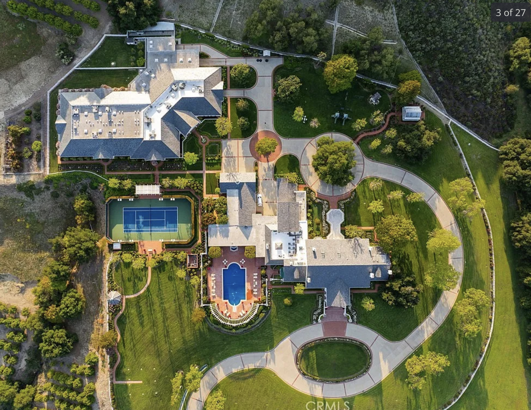 An overhead view of an absolutely immense, sprawling mansion complex with one main house and several other buildings, a pool, tennis court, and landscaping.