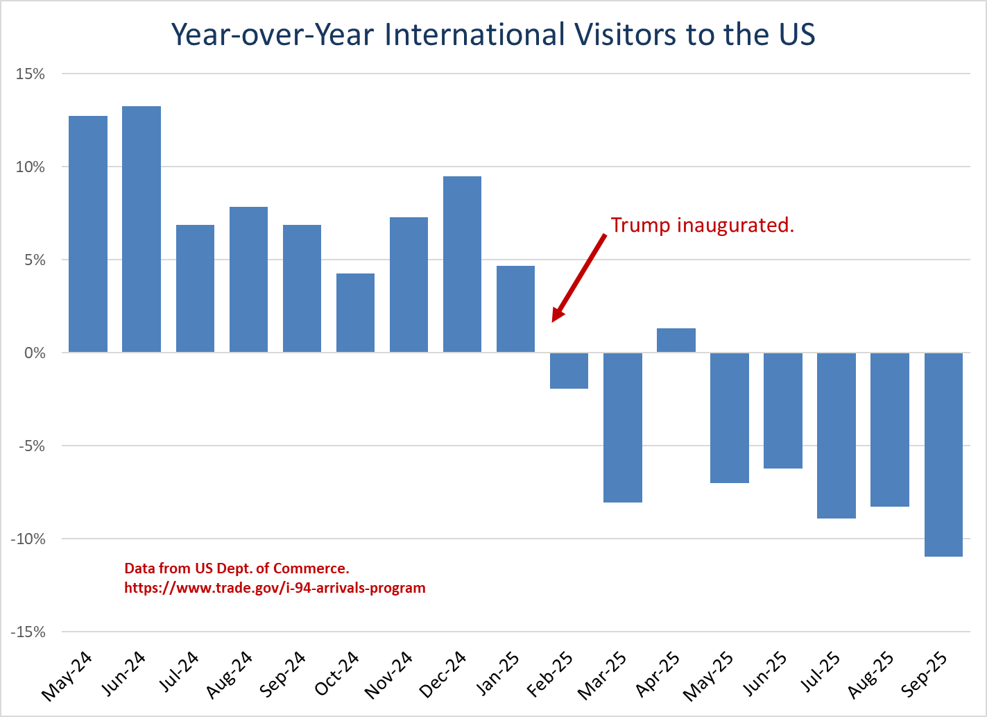 Year-over-year international visitors to the US as a column chart, monthly from May 2024 to September 2025, showing major drops beginning with the Trump administration in February. From May to August, tourism dropped by 5-10 percent from the year before. In September it was down 11 percent.