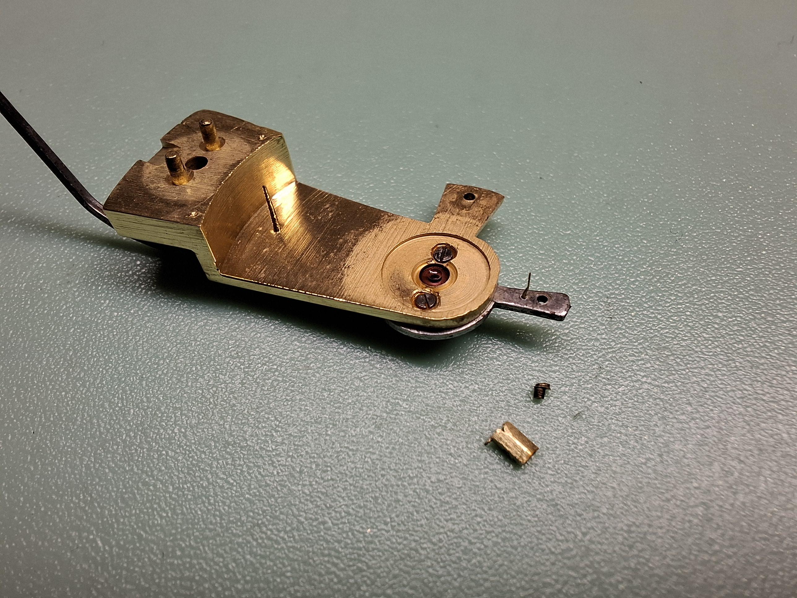 Clef de goupille cassΓ©e sous la raquette de rΓ©glage du balancier-spiral. C'est un pont de balancier Γ l'envers sur la photo