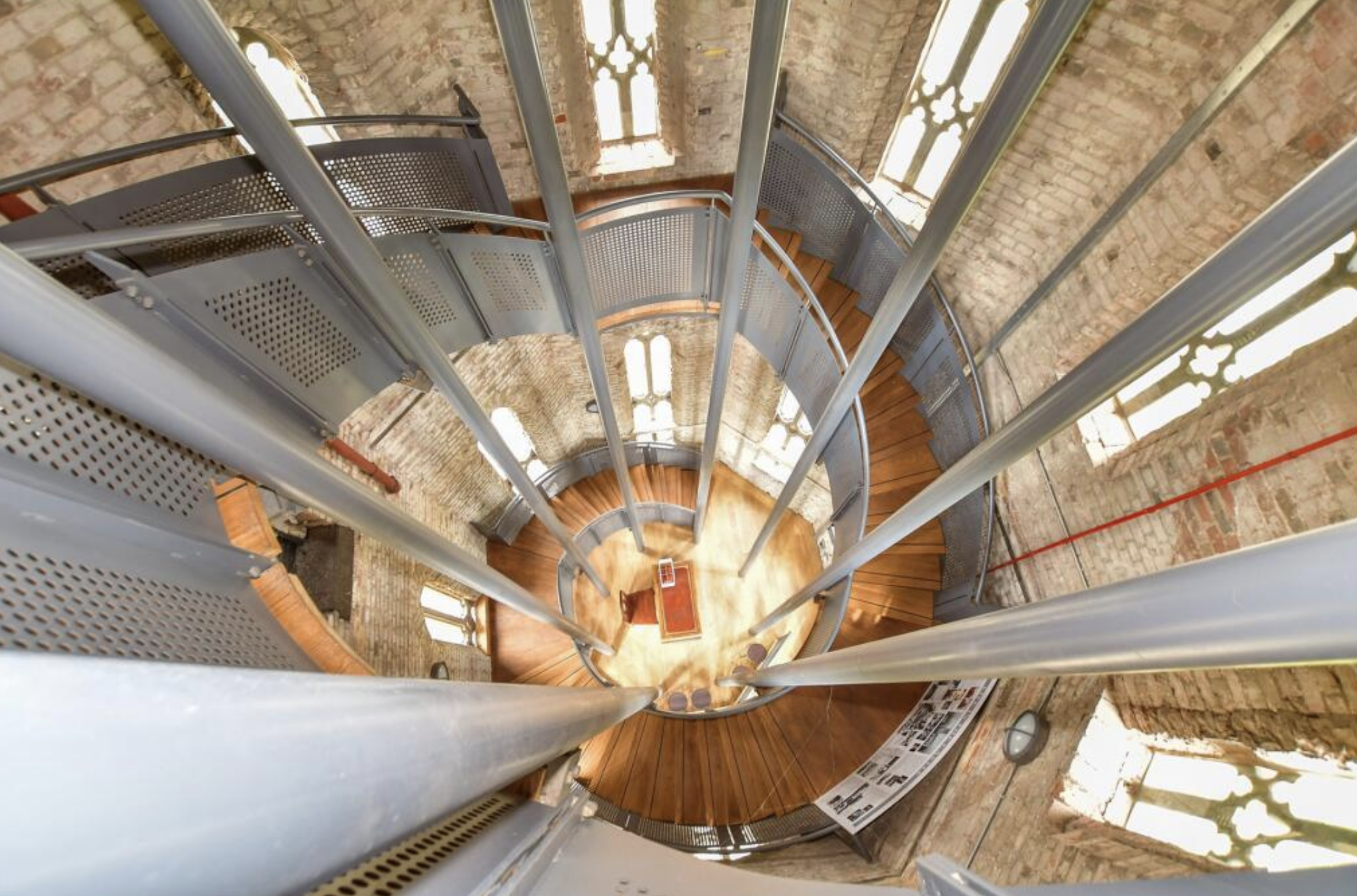 An interior shot from an upper floor looking down into the central cavity of the building, and the stairs going around the perimeter. There are grey poles supporting the structure.