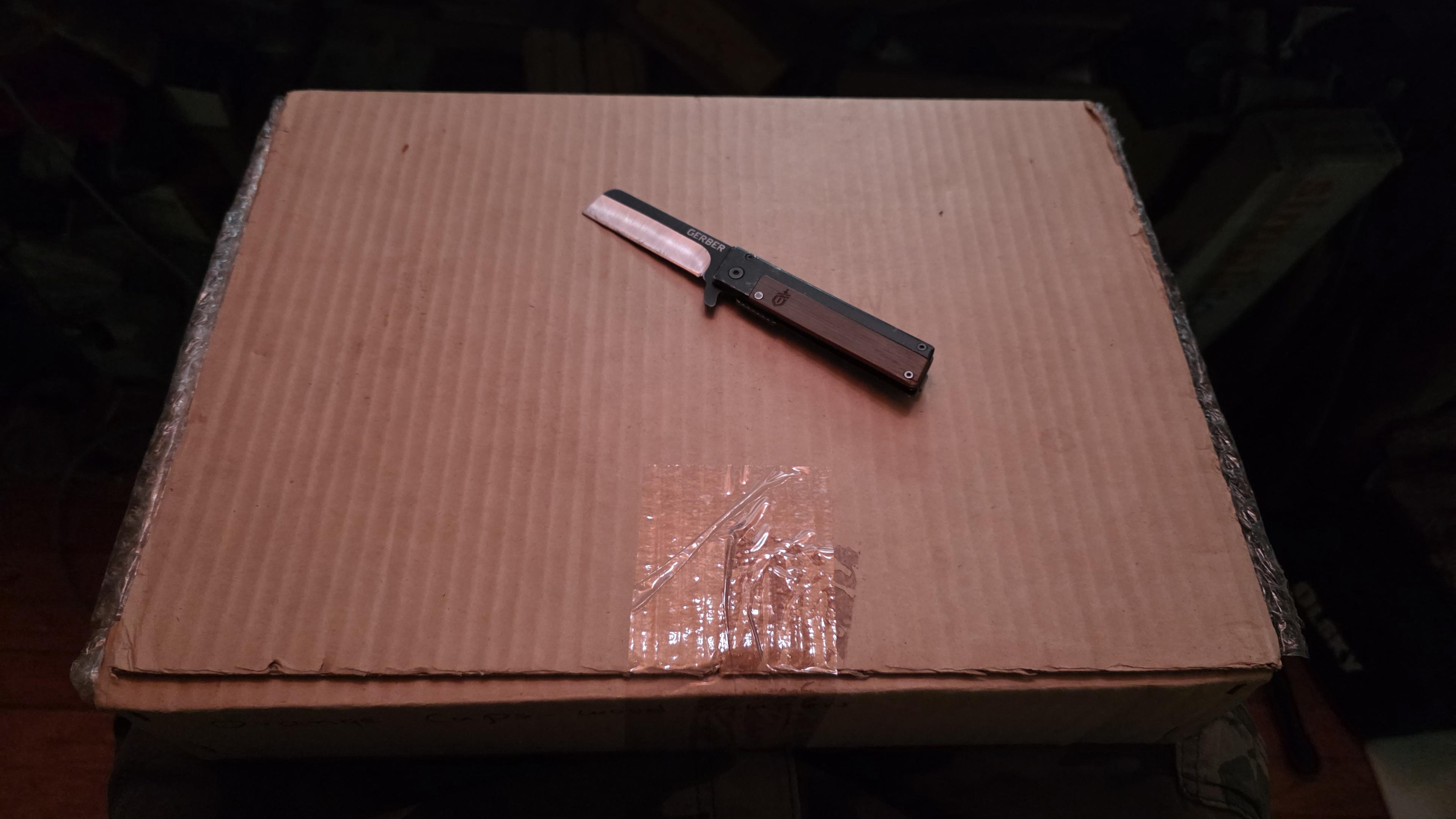 A box that came out of the previous box, with my pocket knife laying on top