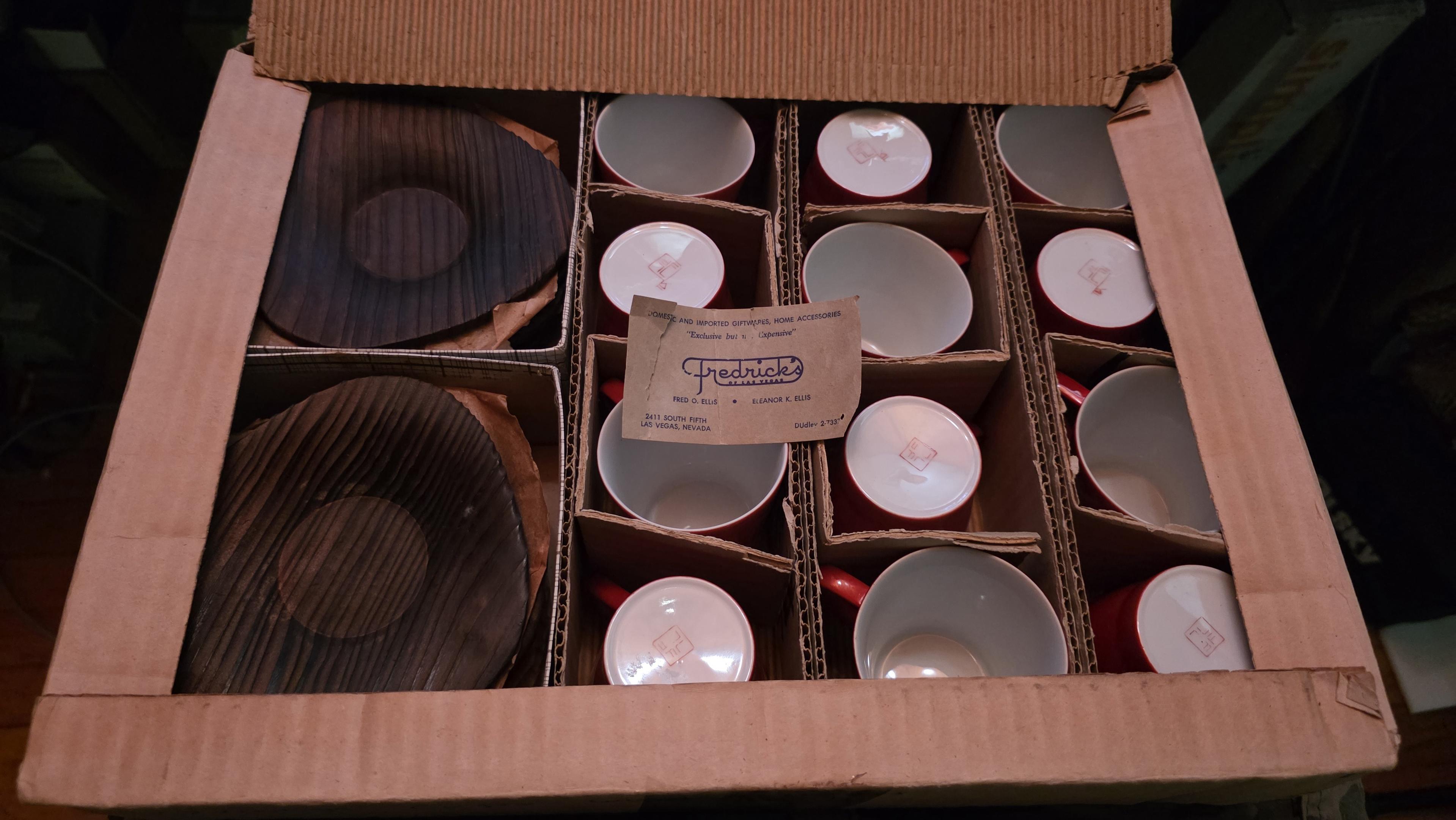 The inner box opened, displaying a set of 12 orange demitasse cups and 12 Japanese cedar saucers
