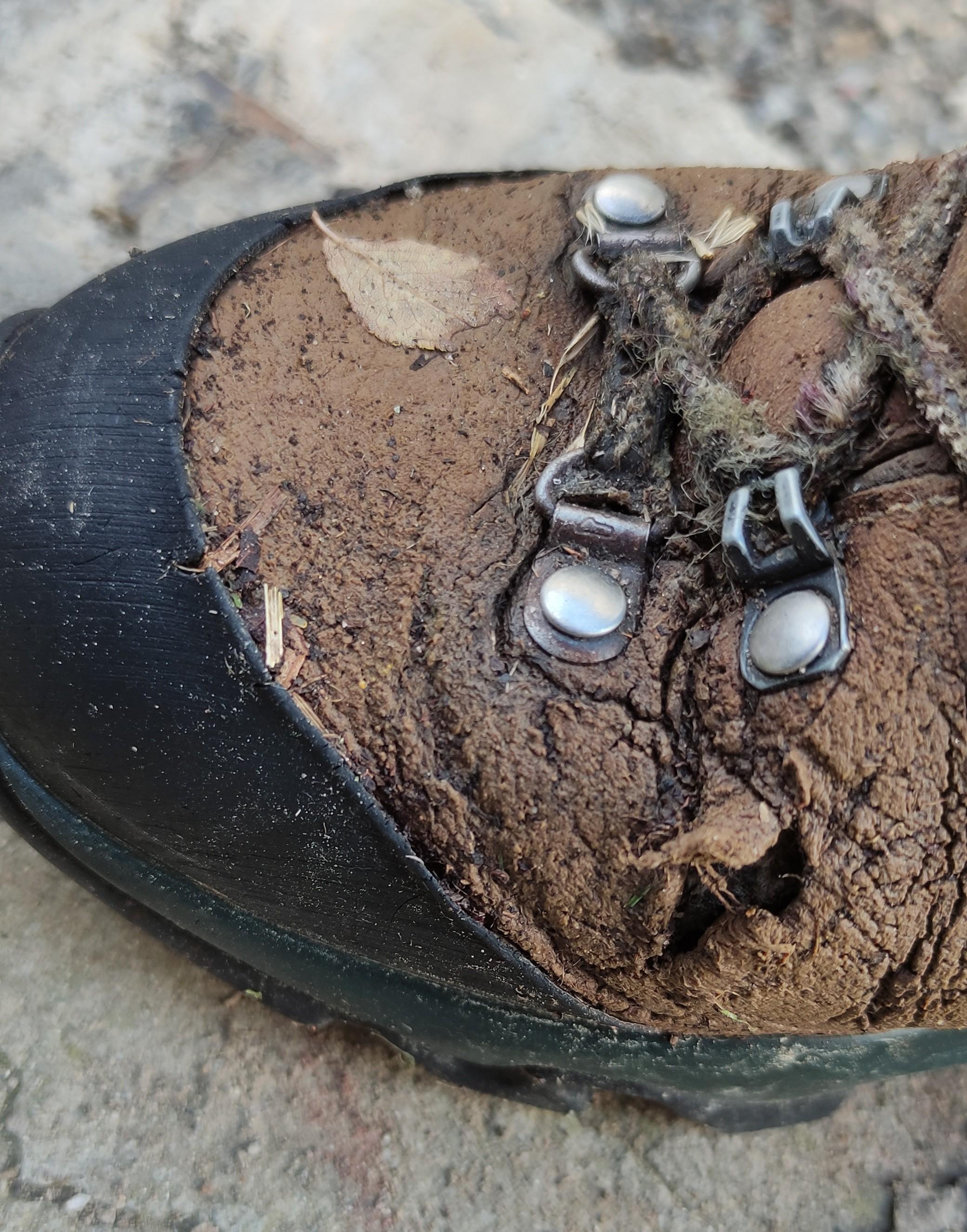 punta di scarpone destro completamente spappolato, cuoio bucato, lacci strappati, gomma in decomposizione