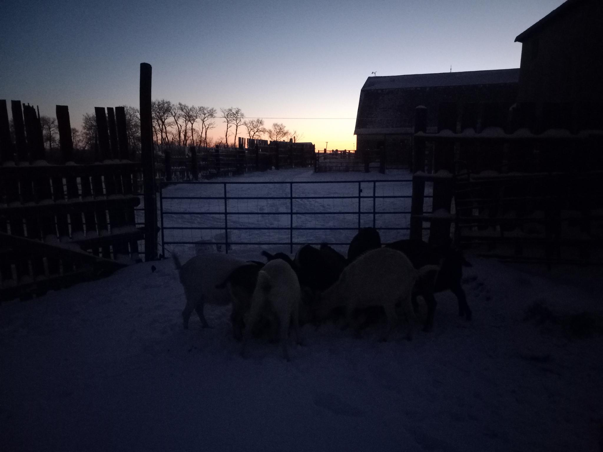 Looking at a bunch of black, white and brown goats all squeezed together eating out of a wooden trough on the ground. In the background is a farmyard and a large barn, and lots of snow. The sky is just getting light for impending sunrise in an hour or so.