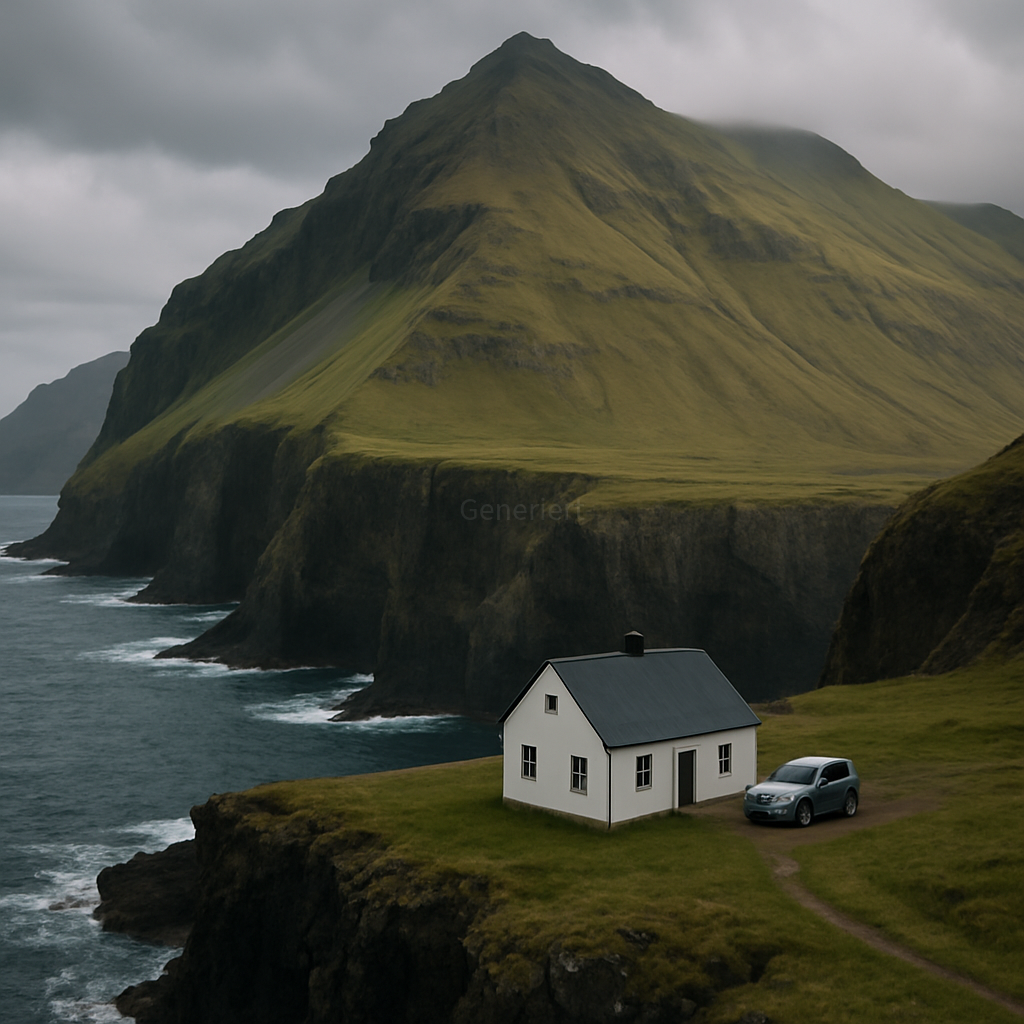 KI Generiertes Bild: Ein kleines weiΓes Haus und ein silberner SUV stehen auf einer grasbewachsenen Klippe mit Blick aufs Meer, im Hintergrund dramatisch aufragende grΓΌne Berge unter grauem Himmel.