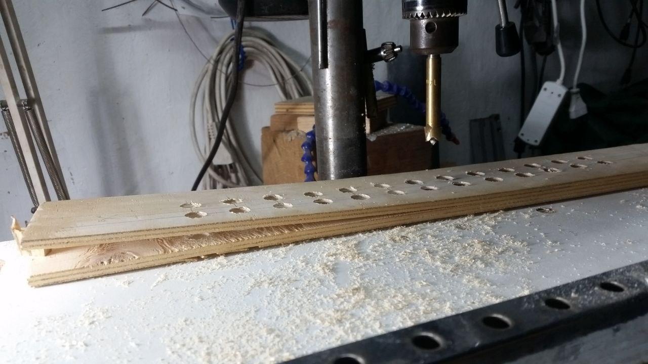Pezzo di compensato con 26 fori da 12 mm. Gli strati si sono 🤬 🤬 🤬 scollati.