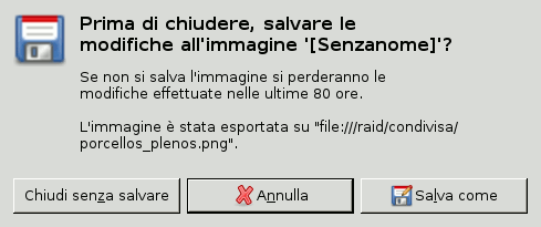 GIMP si premura di chiedermi se voglio chiudere un'immagine non salvata (ma esportata) che รจ lรฌ da 80 ore.