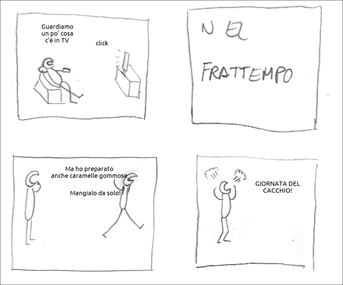 un tizio guarda la tv e dice: «Guardiamo un po' cosa c'è in TV» la TV fa click didascalia: nel frattempo il primo tizio perplesso dice: «Ma ho preparato anche caramelle gommose», il secondo scocciato se ne va dicendo: «Mangialo da solo!» il tizio arrabbiato esclama: «GIORNATA DEL CACCHIO!»