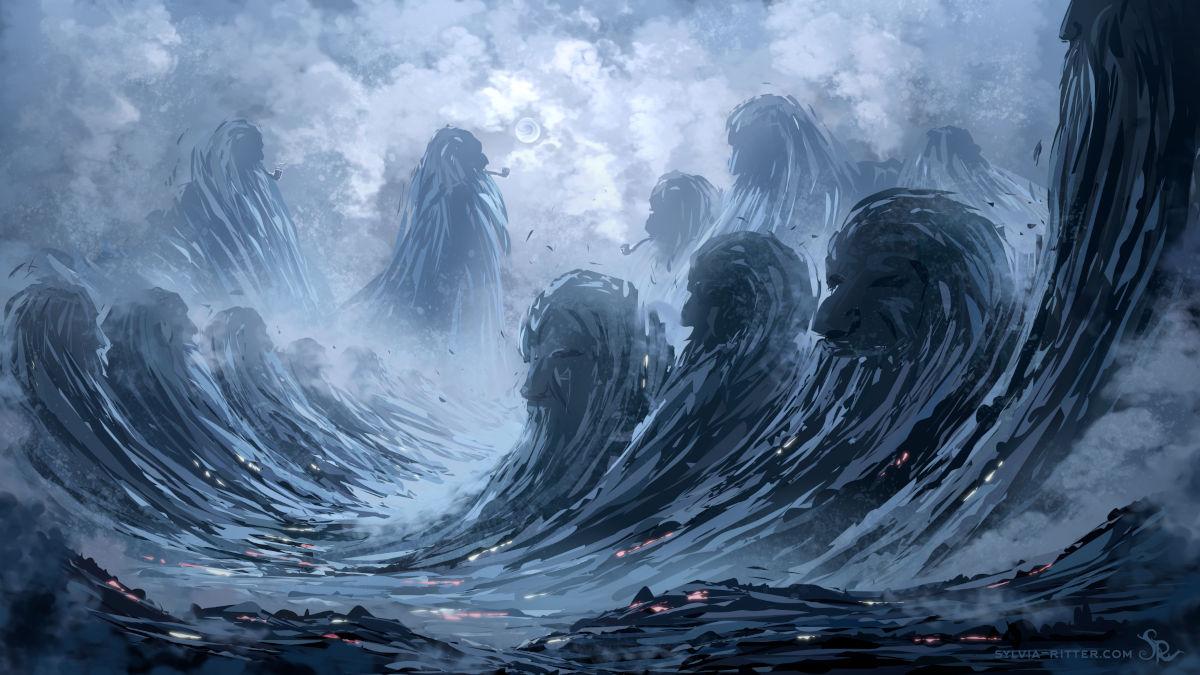 Beard Planet. A snowy sci-fi fantasy landscape (grey, blue, white colors with warmer lights in yellow and pink). Mountain ranges far into the distance. These mountains are unusual, wise old grey men with long snowy beards flowing into the valley. The lead us into the distance to even taller grey man mountains in groups, rock the landscape, or stand alone, and are smoking their pipes. Yes, you assumed correctly. They create all the clouds and fog on this planet. Maybe even the new glowing planet and the snow originated from these magic pipes. How? Well, we can explore this landscape a bit further to find the mystery. In the foreground is a tiny village. Some houses can be found on the stony beards in the valley, and bearded inhabitants are sitting in front of their chimneys, enjoying delicious sweets, a drink similar to hot chai tea, while smoking a pipe. https://www.deviantart.com/sylviaritter/art/Speedpainting-13122025-1274844186