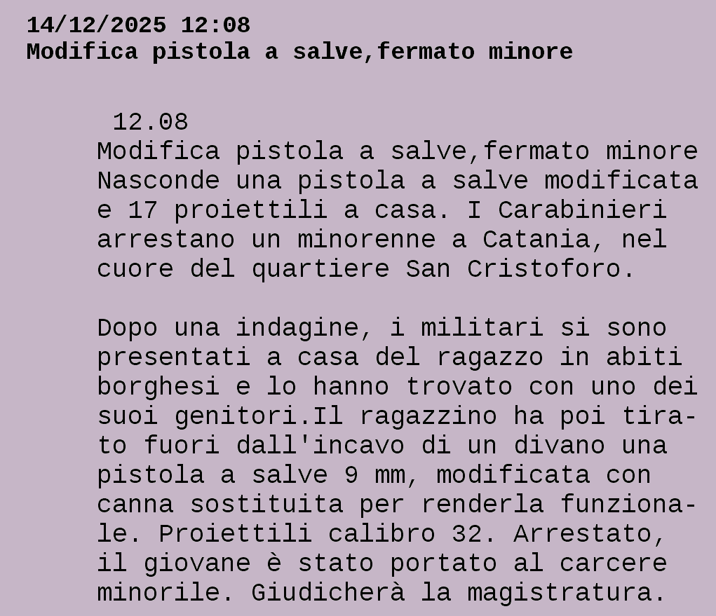 Dal televideo RAI 14/12/2025 12:08 Modifica pistola a salve,fermato minore 12.08 Modifica pistola a salve,fermato minore Nasconde una pistola a salve modificata e 17 proiettili a casa. I Carabinieri arrestano un minorenne a Catania, nel cuore del quartiere San Cristoforo. Dopo una indagine, i militari si sono presentati a casa del ragazzo in abiti borghesi e lo hanno trovato con uno dei suoi genitori.Il ragazzino ha poi tira- to fuori dall'incavo di un divano una pistola a salve 9 mm, modificata con canna sostituita per renderla funziona- le. Proiettili calibro 32. Arrestato, il giovane Γ¨ stato portato al carcere minorile. GiudicherΓ la magistratura.