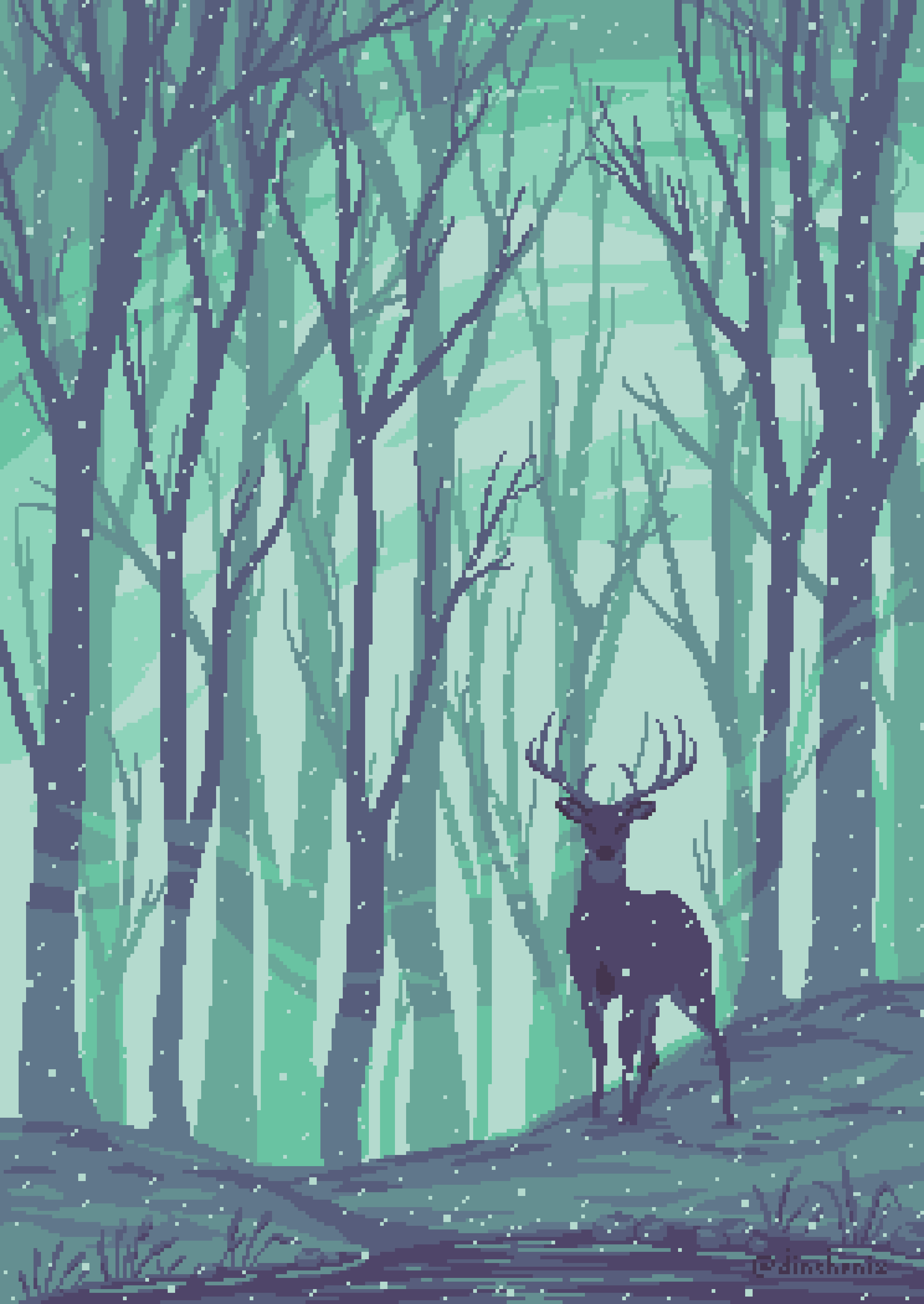 pixelart illustration of a reindeer in a forest, surrounded by trees, in front of it is a shallow pond, snow is falling. the picture is done in different shades of blue and green.