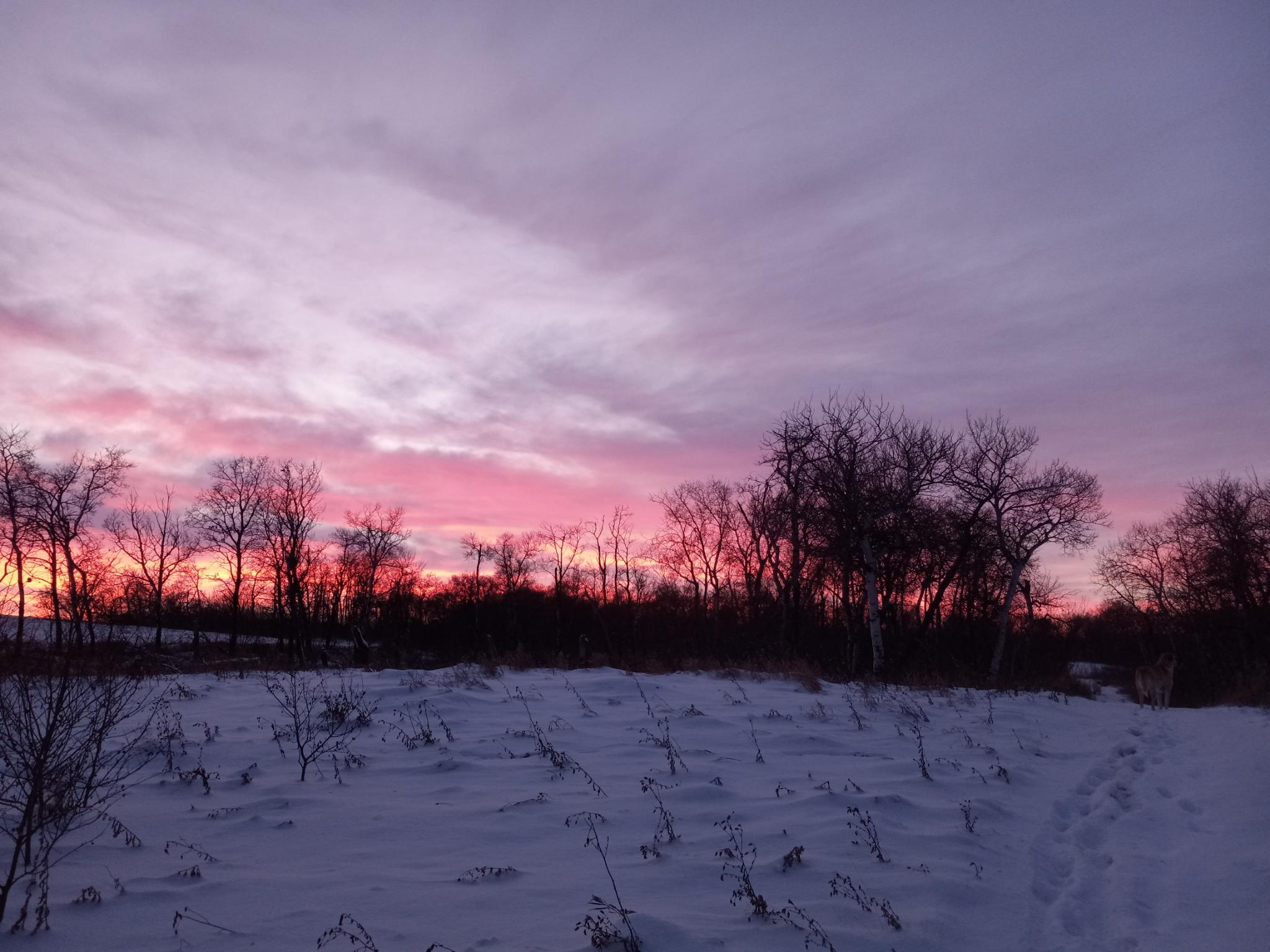 A view of the very bright pink and orange sunset clouds through silhouetted scrubby bare trees. The ground is covered by snow. If you look very carefully you can see a happy yellowish dog trotting along the pathway.