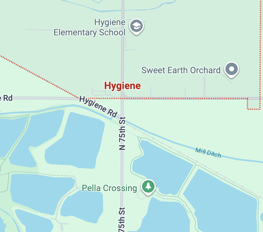 A screenshot of Google Maps showing the town of Hygiene, Colorado in the United States.
