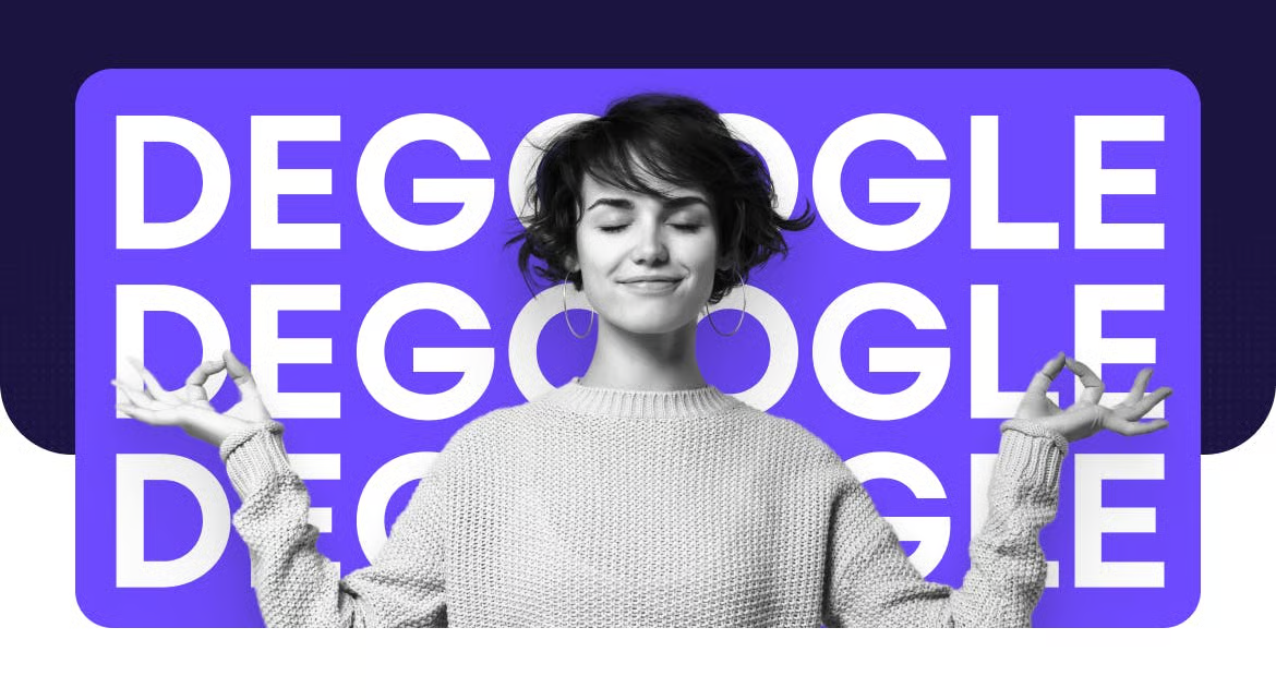 Un ritratto in primo piano di una persona, inquadrato all'interno di un design grafico con testo ripetuto. La persona ha i capelli corti e scuri e indossa un maglione chiaro. Il testo "DEGOOGLE" si ripete in grande, in bianco, su uno sfondo blu, in modo da riempire l'immagine. La persona รจ al centro, con il testo sovrapposto al corpo e al viso. Il testo รจ disposto in verticale e orizzontale, creando un effetto di ripetizione e un'atmosfera grafica.