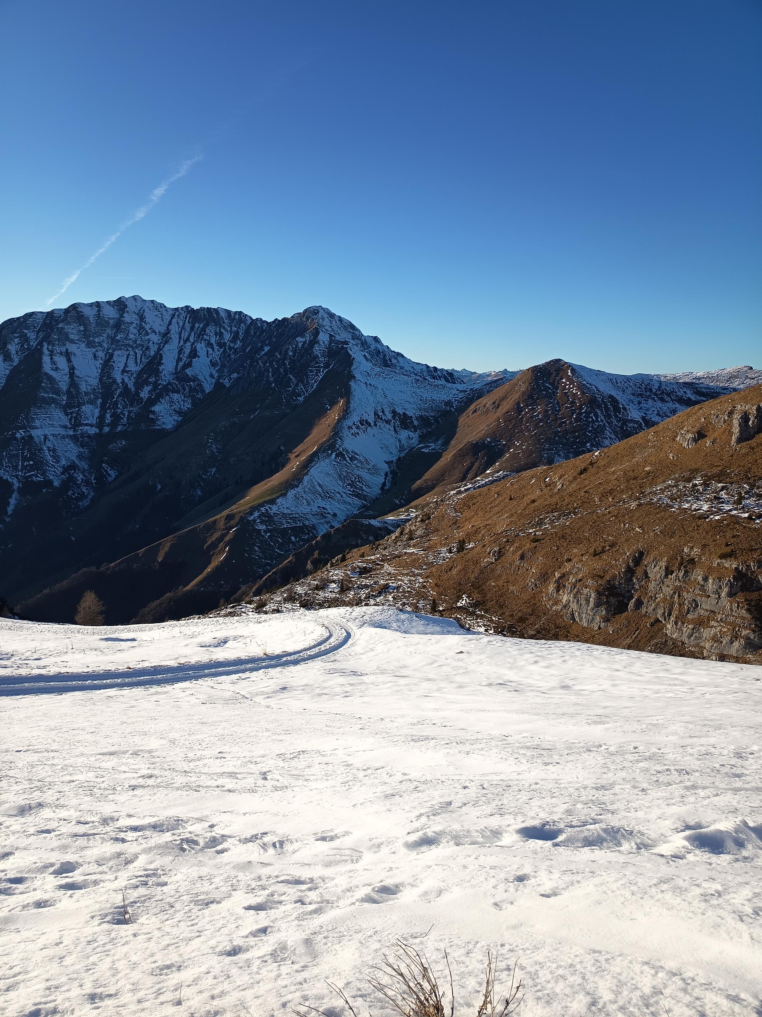 In primo piano un prato coperto da uno strato di neve abbastanza spesso. In secondo piano delle montagne con i pendii all'ombra innevati e i pendii al Sole coperti da erba secca marroncina. Il cielo รจ azzurro limpidissimo