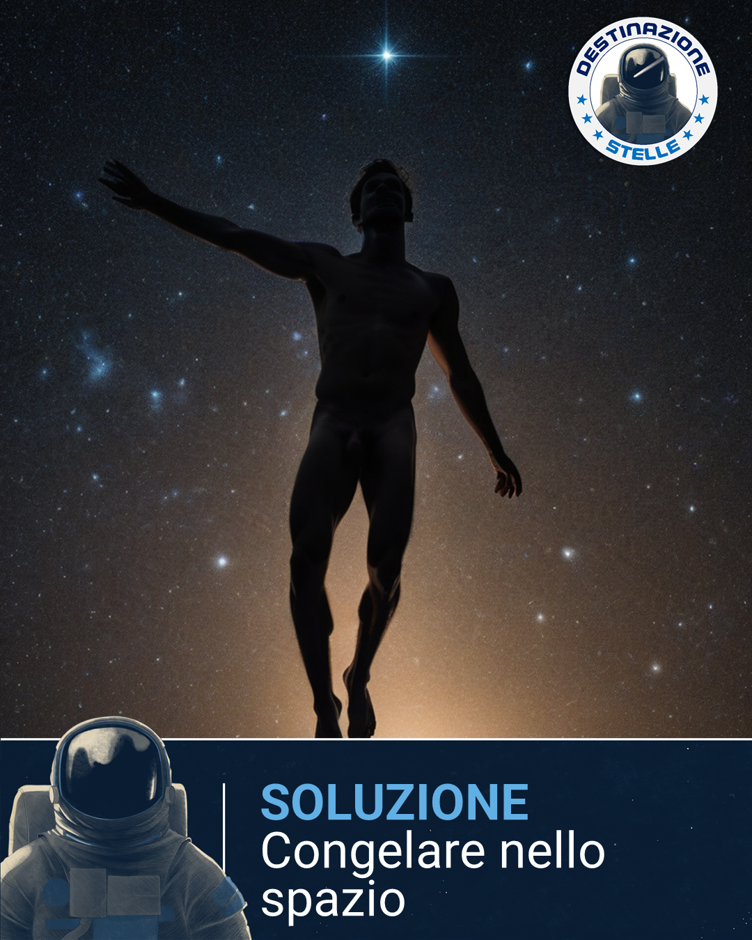 Immagine di un uomo fluttunte nello spazio con la scritta "Soluzione - Congelare nello spazio"
