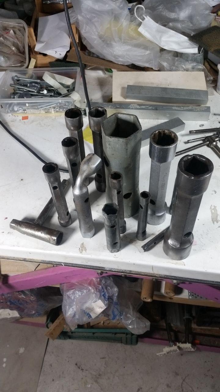 Numerose chiavi a tubo appoggiate in verticale sul tavolo da lavoro.