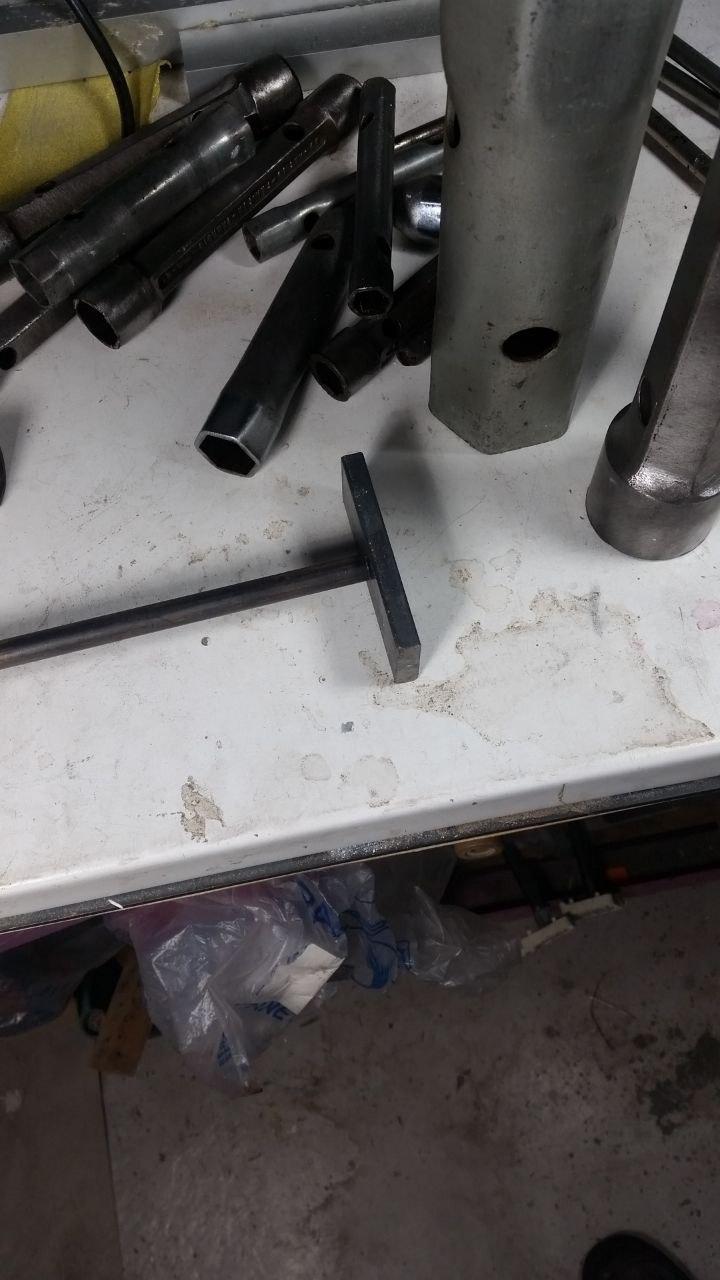 Pezzo di piattina in ferro, sezione 30ร8 mm, lungo 70 mm, al quale รจ appoggiata una barra di tondino di ferro di diametro 10 mm. Dietro un po' di chiavi a tubo.