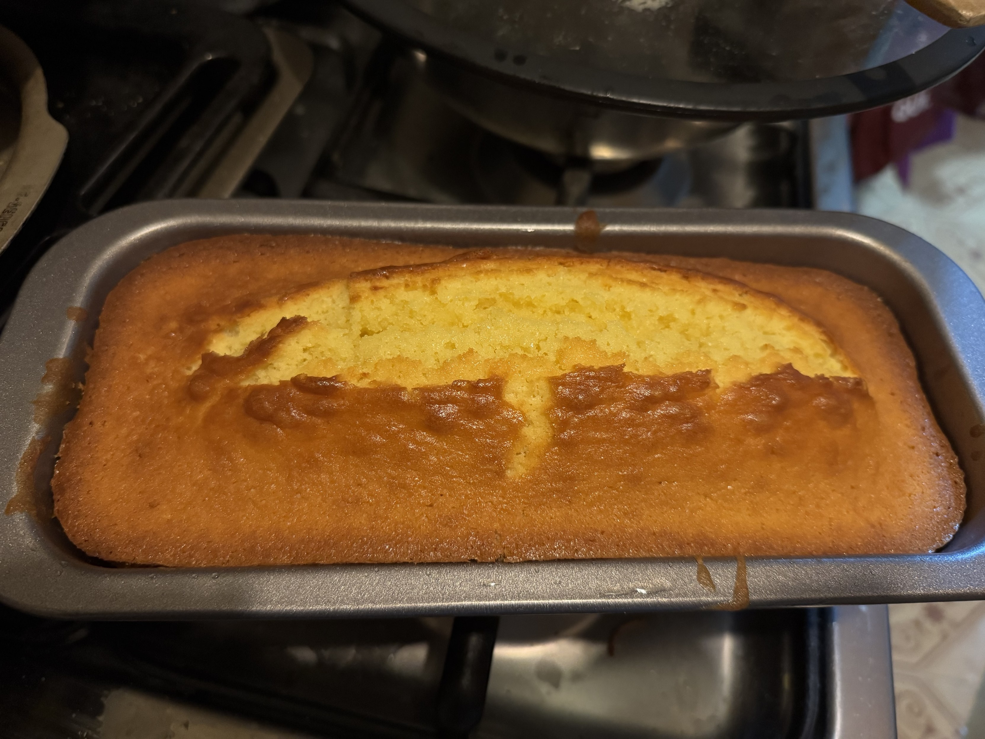 Foto di un plumcake fatto in casa, appena sfornato, all'interno del proprio stampo.