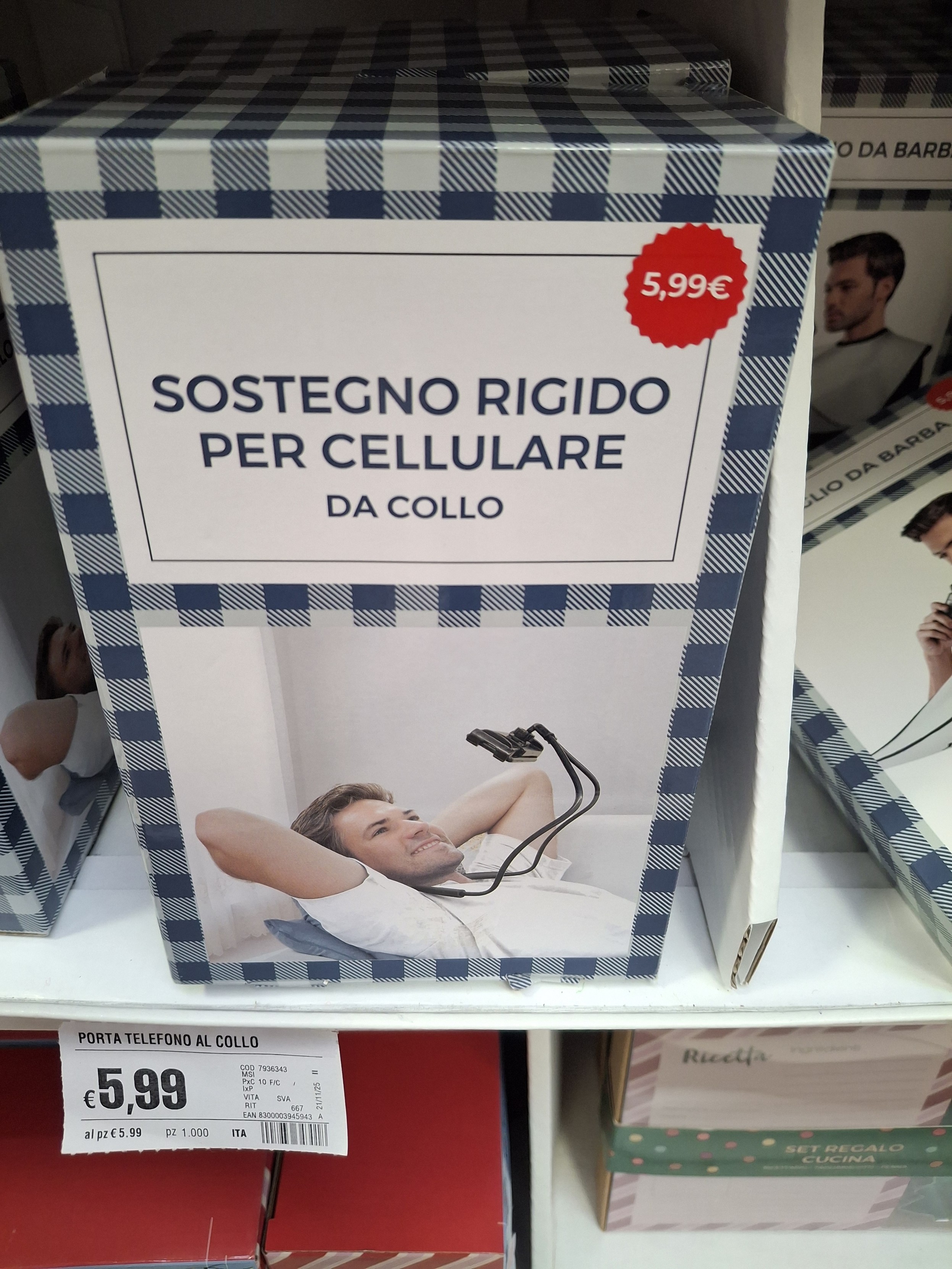 Una scatola con "SOSTEGNO RIGIDO PER CELLULARE da collo"