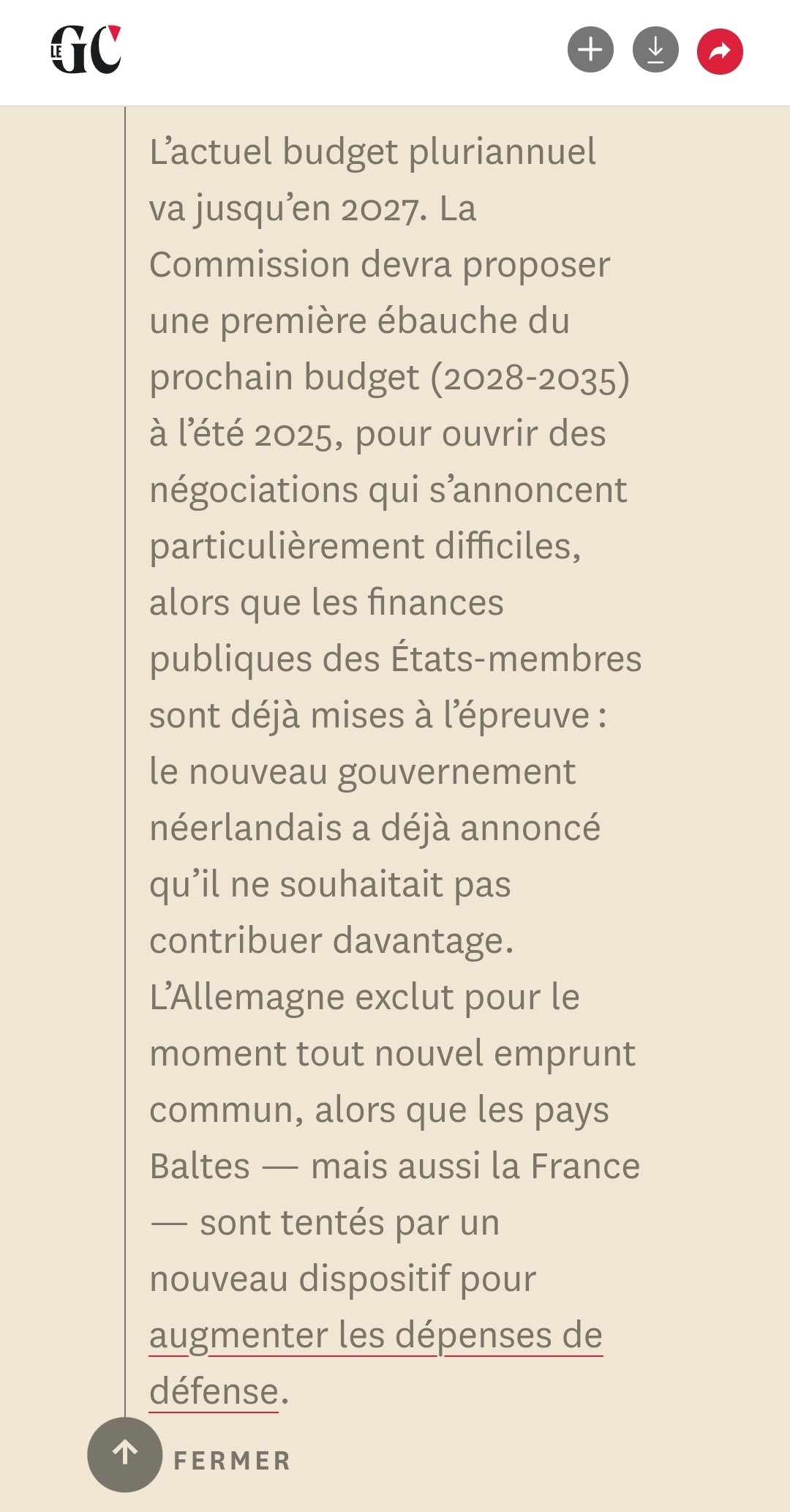 El actual presupuesto plurianual llega hasta 2027. La Comisión deberá proponer un primer borrador del próximo presupuesto (2028-2035) en el verano de 2025, para abrir unas negociaciones que prometen ser especialmente difíciles, en un momento en que las finanzas públicas de los Estados miembros ya están a prueba: el nuevo Gobierno holandés ya ha anunciado que no desea contribuir más.