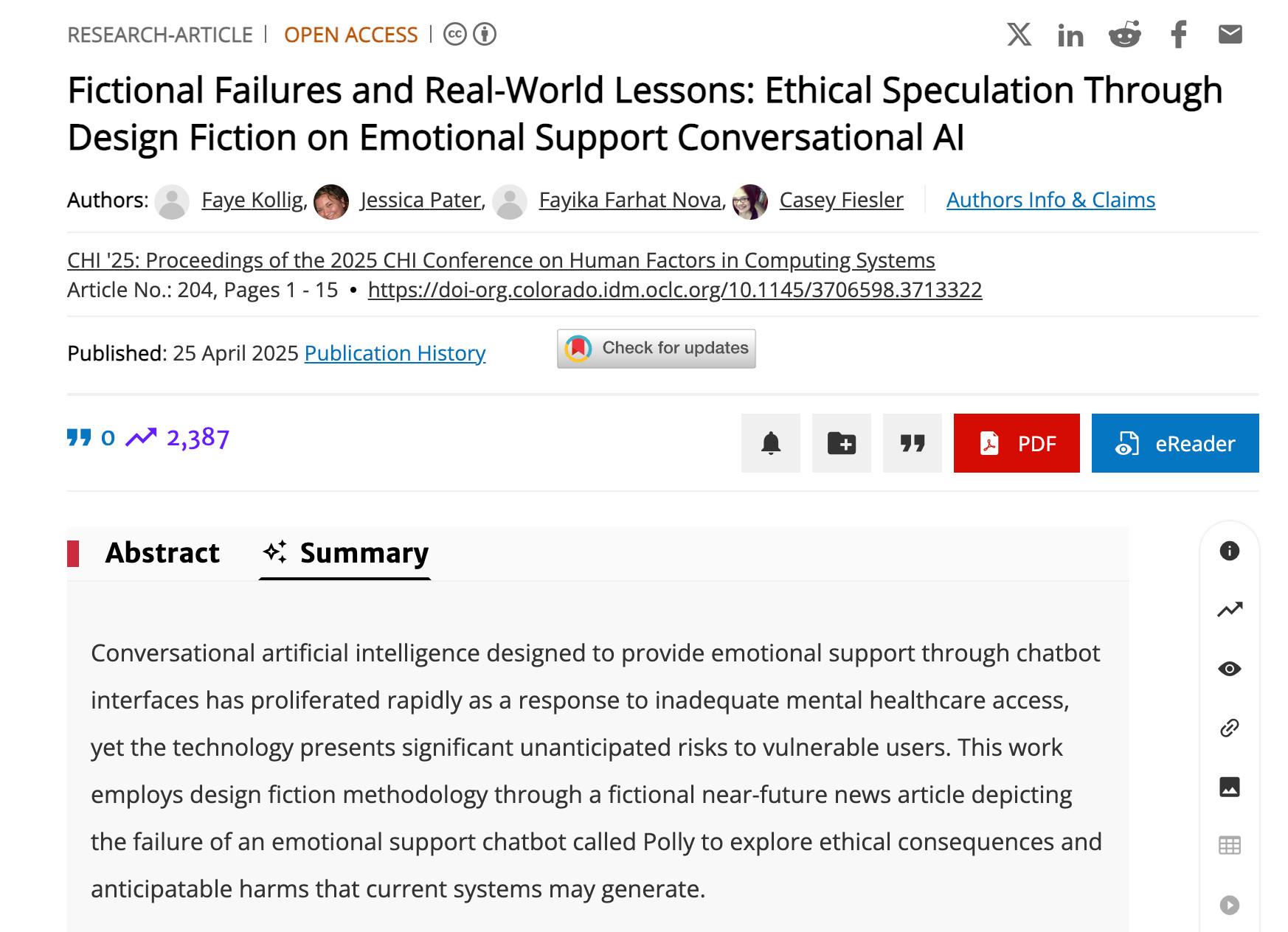 ARTICOLO DI RICERCA | ACCESSO APERTO X inf Fallimenti fittizi e lezioni dal mondo reale: speculazioni etiche attraverso la design fiction sull'intelligenza artificiale conversazionale di supporto emotivo Autori: Faye Spotlight, Jessica Pater, Fayika Farhat Nova, Casey Fiesler Informazioni e affermazioni degli autori CHI '25: Atti della conferenza CHI 2025 sui fattori umani nei sistemi informatici Articolo n.: 204, pagine 1-15 https://doi-org.colorado.idm.oclc.org/10.1145/3706598.3713322 Pubblicato: 25 aprile 2025 Cronologia delle pubblicazioni Controlla gli aggiornamenti 0~2,387 PDF eReader Abstract Riepilogo L'intelligenza artificiale conversazionale progettata per fornire supporto emotivo attraverso interfacce chatbot si รจ diffusa rapidamente in risposta all'accesso inadeguato all'assistenza sanitaria mentale, tuttavia la tecnologia presenta significativi rischi imprevisti per gli utenti vulnerabili. Questo lavoro utilizza la metodologia della design fiction attraverso un articolo di cronaca immaginario ambientato nel prossimo futuro che descrive il fallimento di un chatbot di supporto emotivo chiamato Polly per esplorare le conseguenze etiche e i danni prevedibili che i sistemi attuali possono generare