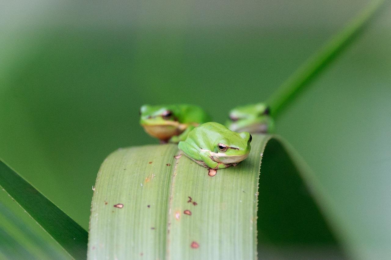 Three tiny green frogs on a curved reed leaf. At the leaf peak, the three frogs sit as if posing for an album cover with the lead frog being just over the peak and angled to the right. βDrummer frogβ in the back only has its head visible and is out of focus.