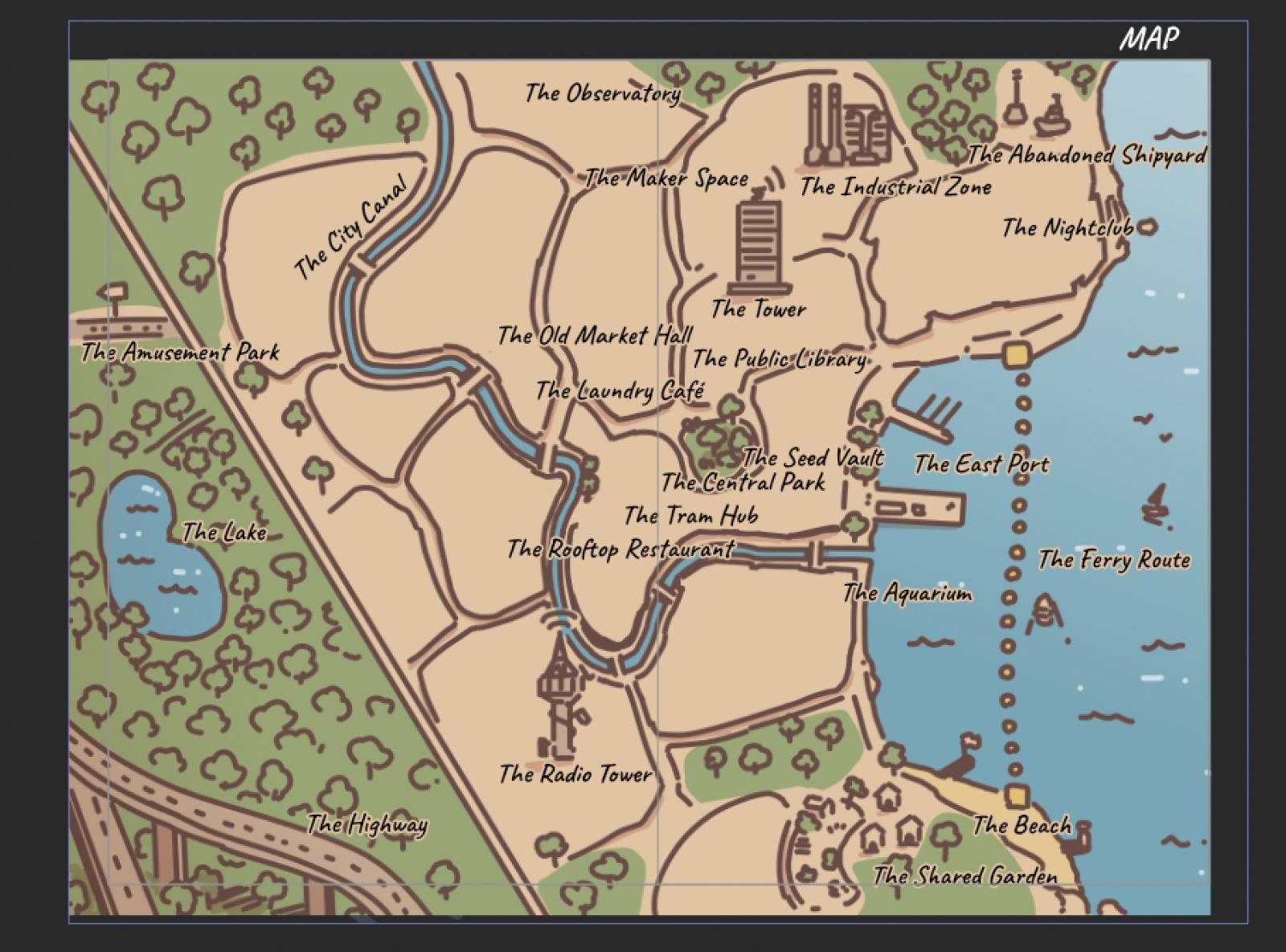 Map of a coastal city, with the ocean on the left. A few district are laid down, along with notable location such as towers and parks. The right side is cut to show a forest further west, with a lake an a highway