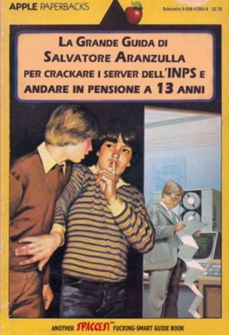 Copertina del libro fittizio "La grande guida di Salvatore Aranzulla per crackare i server dell'INPS e andare in pensione a 13 anni". La copertina รจ gialla con testo nero e al centro c'รจ il disegno di due bambini in stile anni 50. Uno dei due fa cenno all'altro di fare silenzio mentre si affacciano alla porta di quello che sembra un mainframe. Sullo sfondo si vede un operatore che legge un tabulato e un computer a nastri.