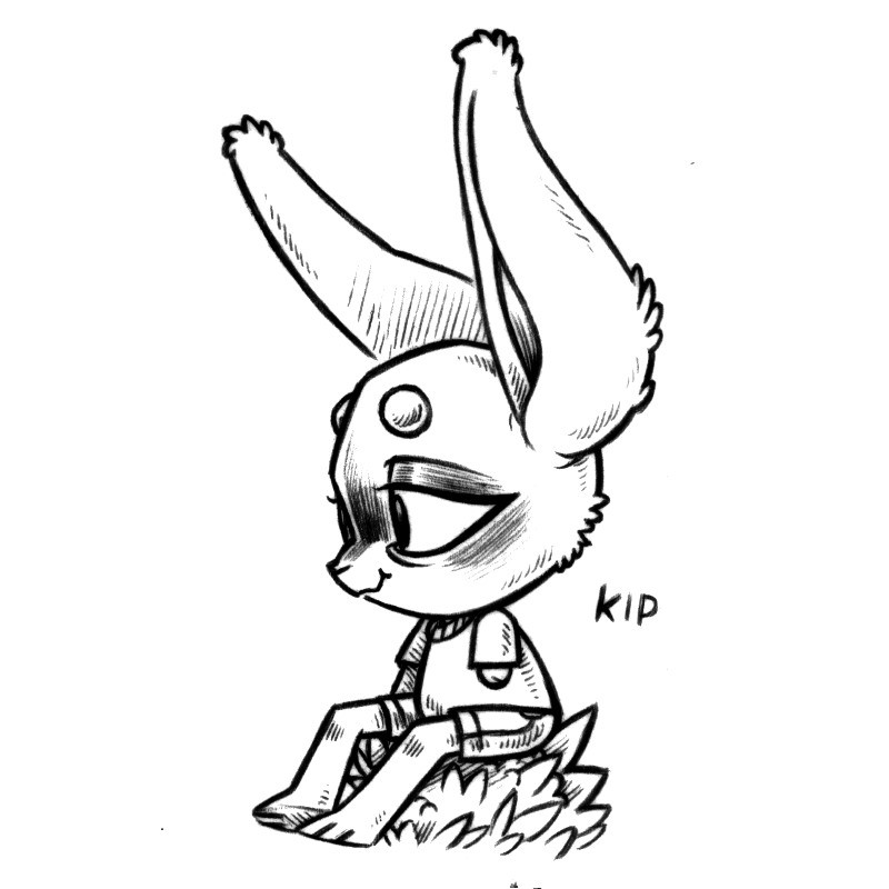 an ink drawing of a humanoid rabbit named Kip, sitting on a grassy, raised area on the ground. Kip has thick long ears, rounded eyebrows, and is one-armed. Kip has a relaxed expression.