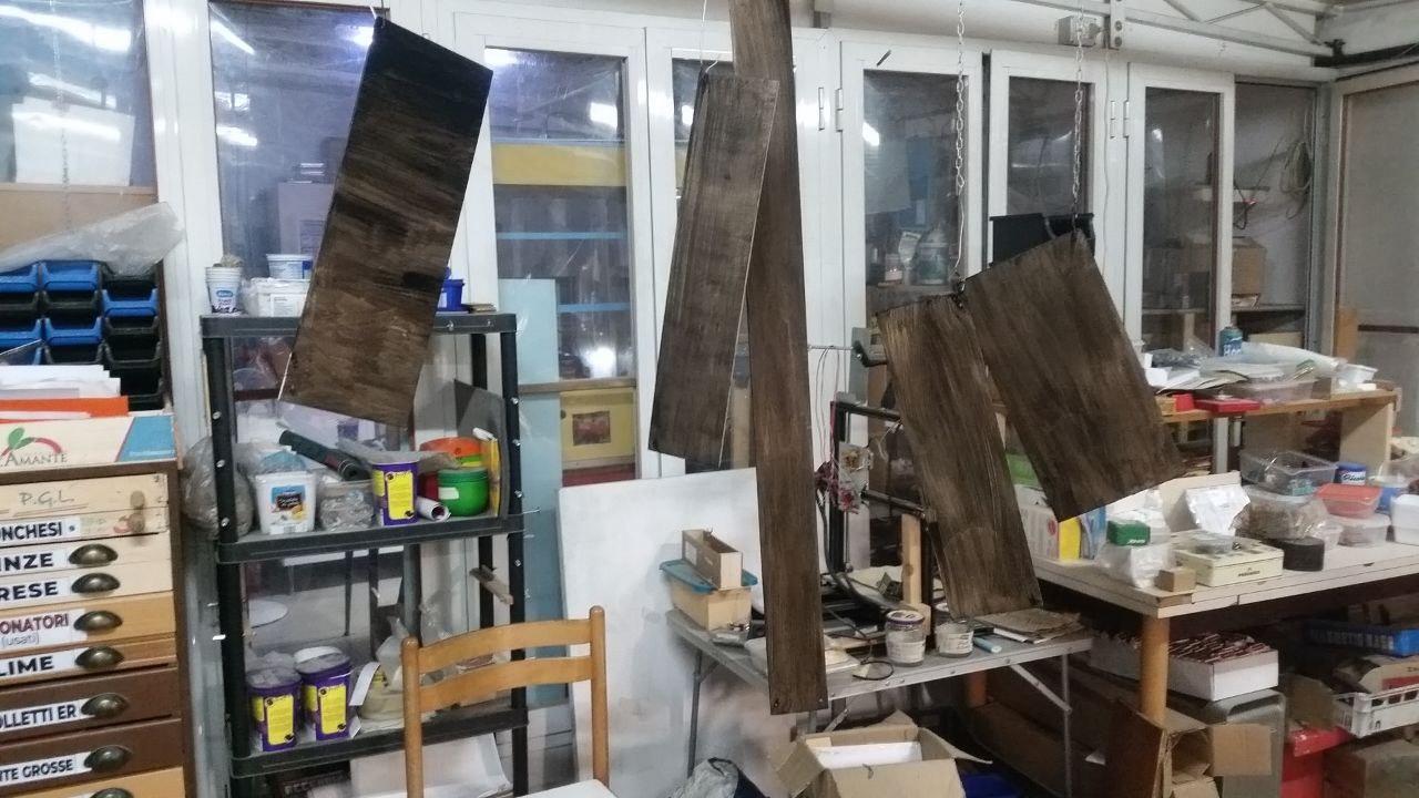 5 pannelli di compensato appesi al soffitto, con una prima mano di vernice a lavagna.