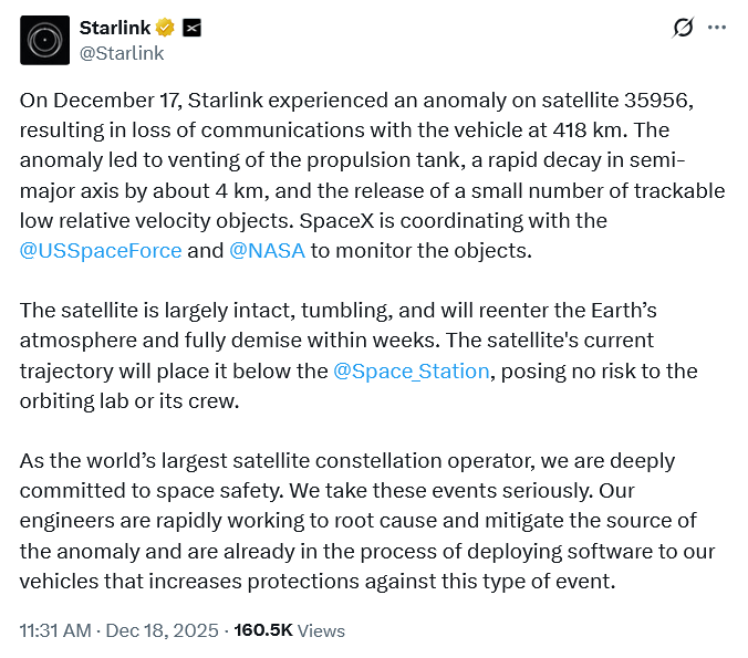Tweet from Starlink @Starlink On December 17, Starlink experienced an anomaly on satellite 35956, resulting in loss of communications with the vehicle at 418 km. The anomaly led to venting of the propulsion tank, a rapid decay in semi-major axis by about 4 km, and the release of a small number of trackable low relative velocity objects. SpaceX is coordinating with the @USSpaceForce and @NASA to monitor the objects. The satellite is largely intact, tumbling, and will reenter the Earthβs atmosphere and fully demise within weeks. The satellite's current trajectory will place it below the @Space_Station, posing no risk to the orbiting lab or its crew. As the worldβs largest satellite constellation operator, we are deeply committed to space safety. We take these events seriously. Our engineers are rapidly working to root cause and mitigate the source of the anomaly and are already in the process of deploying software to our vehicles that increases protections against this type of event. https://x.com/Starlink/status/2001691802911289712