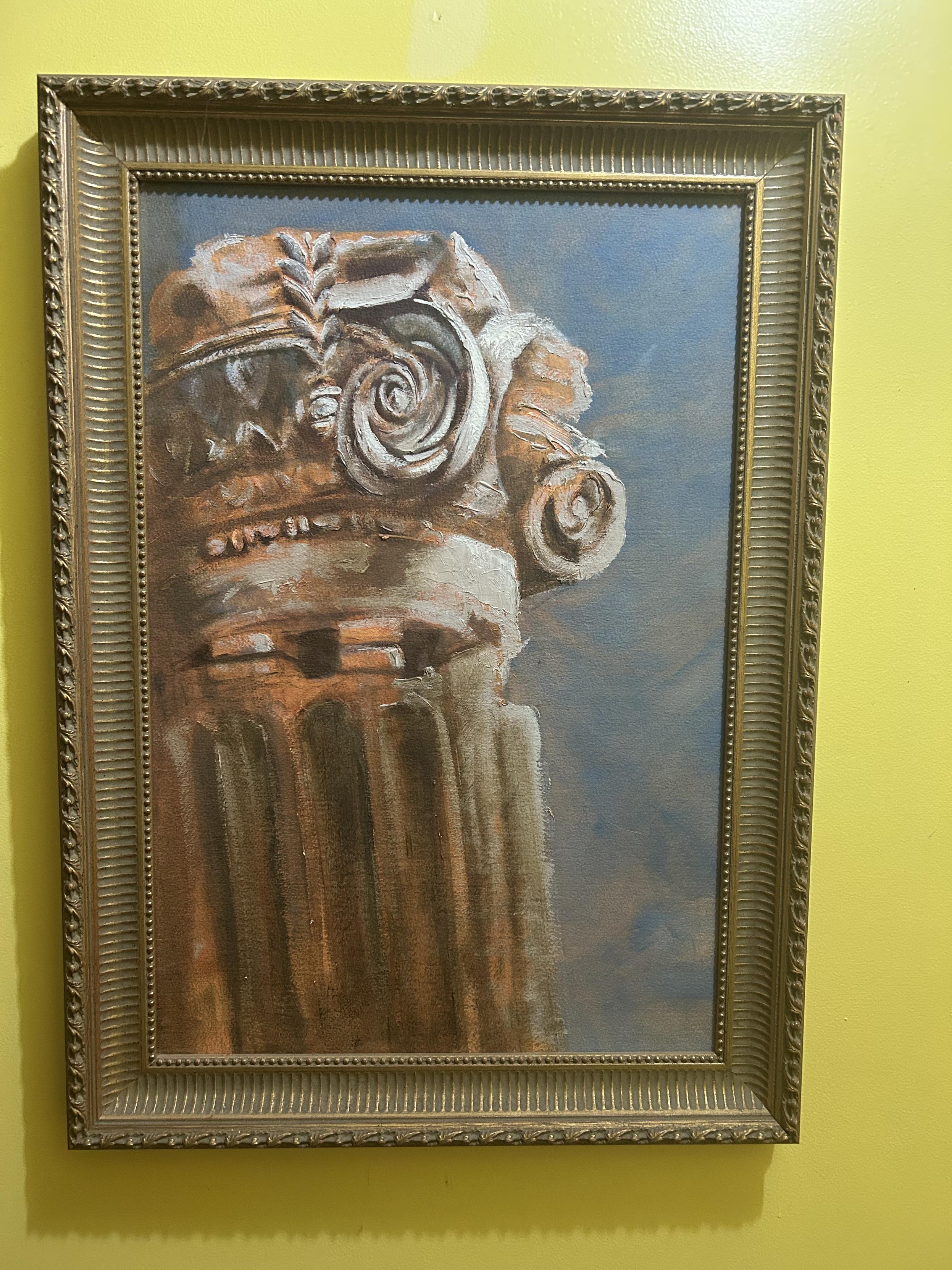 Painting of a stone column in Pompeii, it is gray with red on a blue background.