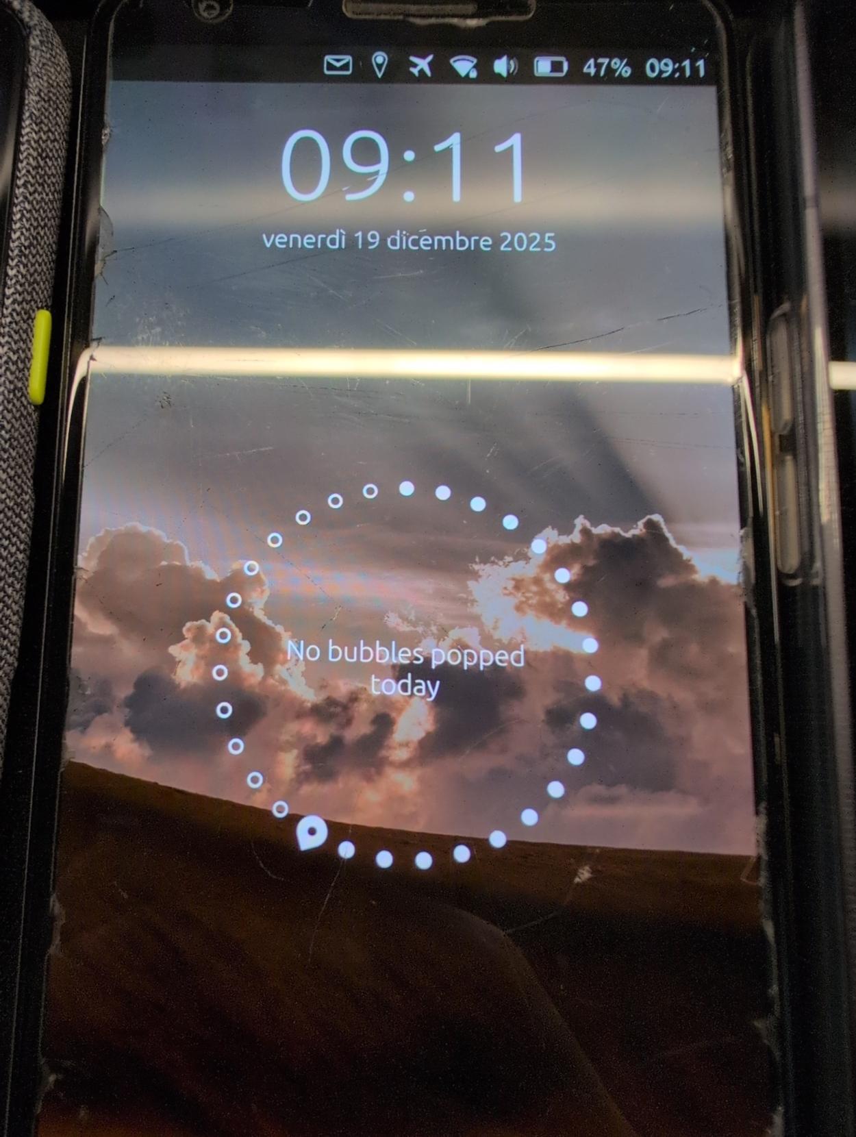 The Ubuntu touch lockscreen saying "No bubbles popped today".