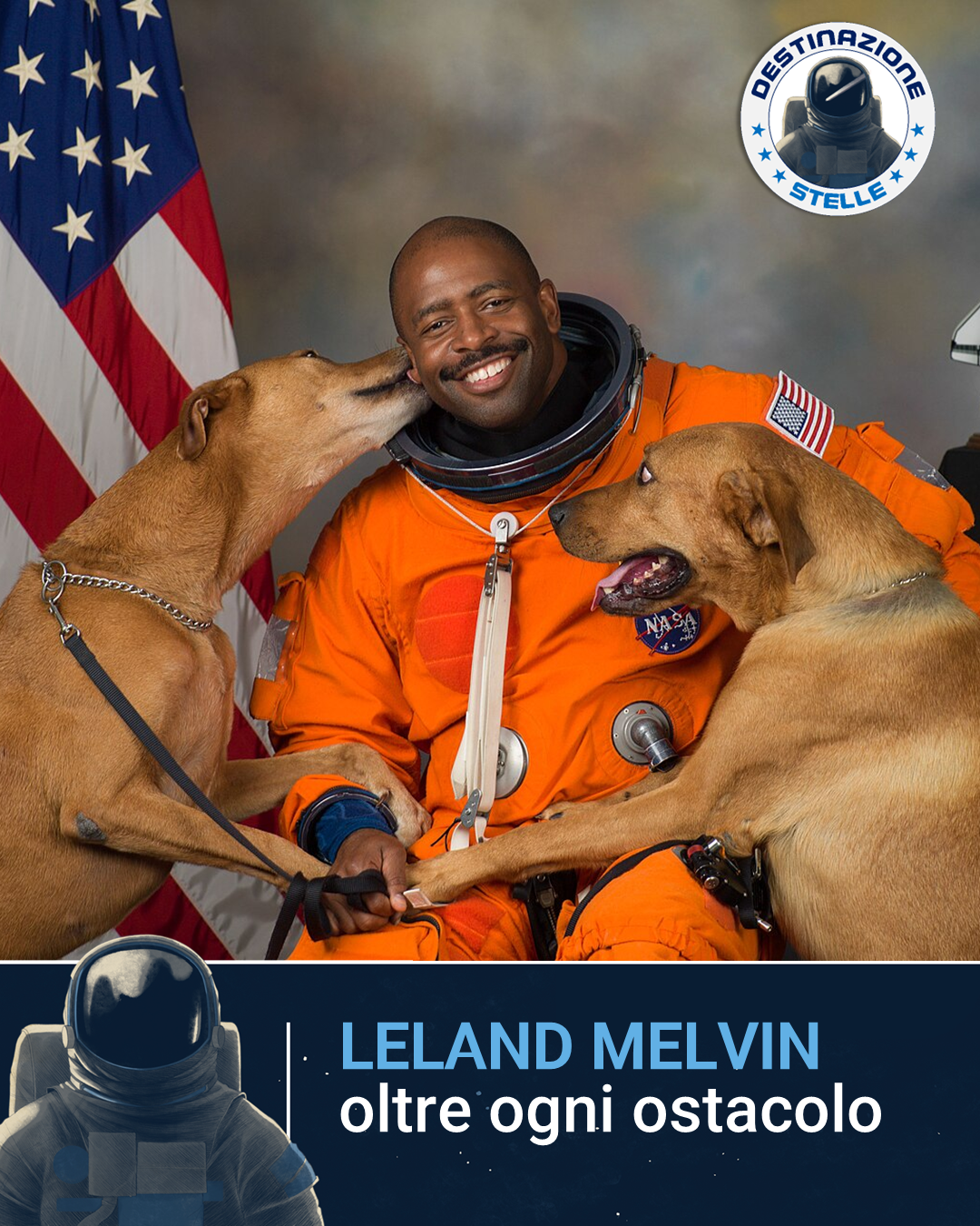 Fotografia di Leland Melvin con i suoi due cani e la scritta "Leland Melvin - oltre ogni ostacolo"