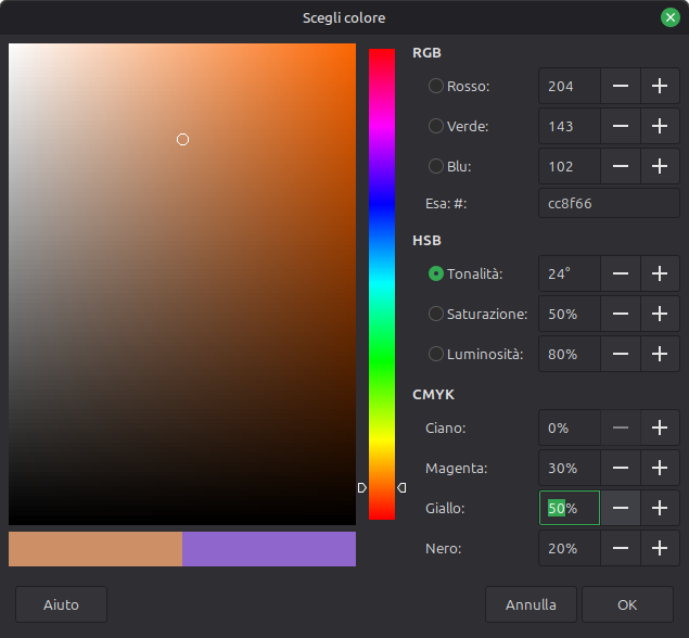 Seleziono colore carattere con 0% blu, 30% rmagenta, 50% giallo e 20% nero in Writer