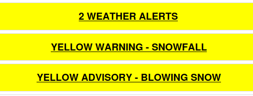 Screenshot from the Weather Canada website showing "2 weather alerts" and then "Yellow warning - snowfall" and "yellow advisory - blowing snow". How fun.